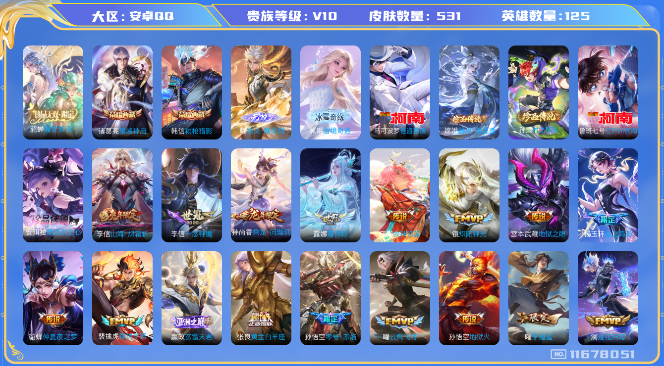 [11678051]V10 2典藏 1珍品无双 2无双 5珍品传说 60传说 125英雄 531皮肤 可修改实名 优质装备:馥梦繁花,星域神启(倪克斯贼亮),弑枪猎影(韩信典藏),雪境奇遇-甄姬,器灵·螭龙剑,江户川柯南,怪盗基德,器灵·落星盏,酷洛米之心,黄金狮子座,云鹰飞将(小将军),绛天战甲(鸡嘴战神),黄金白羊座,久胜战神,炽阳神光,一念神魔,云霓雀翎,地狱火,仲夏夜之梦(大飞蛾),零号·赤焰,地狱之眼,胖达荣荣,李逍遥,乞巧织情,游龙清影(小青龙),淬星耀世,超时空战士-狄仁杰,挚爱之约,无双飞将,山海·炽霜斩(李信年限),炽翼辉光(娃娃菜牛角包),浮生妄,百相守梦(张飞),霜月吟,澜逐花归海,艾琳觅芳踪,牧神诗旅,玄雷天君,千劫归真 珍品传说:时之奇旅-孙策 传说皮:乘龙·问璇玑(孙尚香年限),典韦战鼓燎原,云诺千山,铠冥王哈迪斯,续相思,星之鸣奏,祥瑞亨通,幻光神枪 珍宝阁皮:妄想食味,优雅恋人,女武神,玩趣恶龙 限定皮:愿照·九州拓(澜年限),愿照·福禄聚(蔡文姬年限),愿照·岁时盈(虞姬年限),愿照·山河定(司空震年限),愿照·众生和(妲己年限),愿照·千秋盛(女娲年限),逐霄战戟,映山客,陌上桑,鸣野蒿,夏侯惇霜北刀,至尊宝,白虎志(电光耗子),凤求凰(白切鸡),太华(伽罗年限),异界灵契(白毛香),白鹤梁神女,白晶晶,时雨天司(水龙头),飞衡(韩信年限),遇见飞天,高山流水,诗剑行,齐天大圣,匿光决锋者,五谷丰年,青龙志(铠年限),冰锋战神,武圣,天狼运算者,游园惊梦,梁祝,御风骁将(吕布年限),天狼狩猎者,烈魂,天狼溯光者,奔雷神使(牛魔年限),祈雪灵祝(雪兔子),李小龙,如梦令-后羿,霸王别姬-虞姬,圣诞老人,默契交锋-兰陵王,默契交锋-花木兰,猪悟能,一生所爱,引擎之心,神奇女侠,寅虎·赤拳(老虎年限),启示之音,梦圆繁星,山海·玄木吟(马可年限),冰霜神祇 史诗皮:鸭鸭历险记-刘禅,飞车小橘子,苍鳞隐世,器灵·浮梦炉,糖绘人间,狼魂孤将,绮世丹青,瑰影绮梦,化蝶舞,星界特工,星界战将,灵蛊蚀心,龙之律动,雪豹·霜爪,藏狐·褐绒,石田雨龙,百相守梦-周瑜,戍鼓铭心,茶境仙,海诺心动手记,破空之剑,战舞者,涂山红红,东方月初,蒙犽顽岩魄,埋骨钱,芈月浮光幕影,怒海争锋,谪仙醉月,上官婉儿群星魔术团,蔬乡物语(鲁班七号),百相守梦-百里守约,炽弈燎原,百相守
