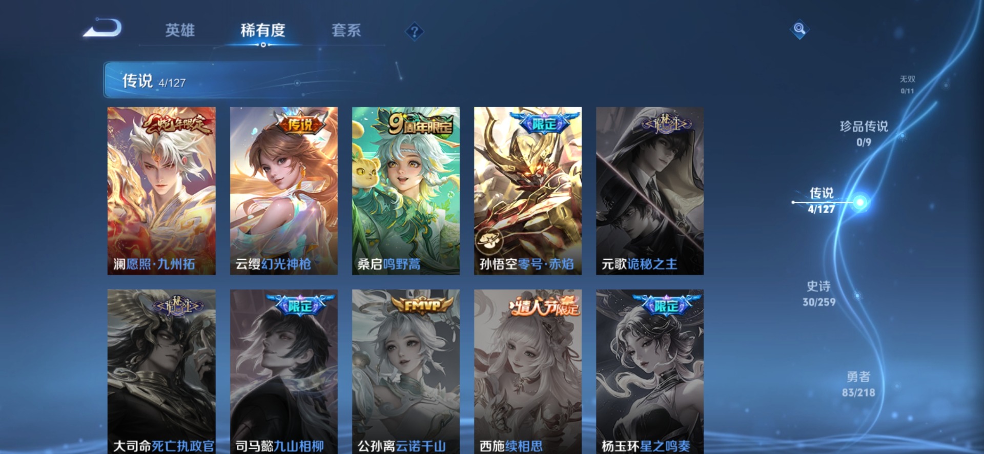 夏侯惇朔风刀,老夫子醍醐杖,盾山御銮,苏烈千军破阵,牛魔御旌,项羽苍威无极,镜青焰无极,元歌云间偶戏,明世隐疑决卦,马可波罗暗影游猎,白起狰,鬼谷子原初探秘者,张良古海寻踪,狄仁杰万华元夜,芈月重明,程咬金演武夺筹,弈星混沌棋,米莱狄御霄,钟馗驱傩正仪,狂铁御狮