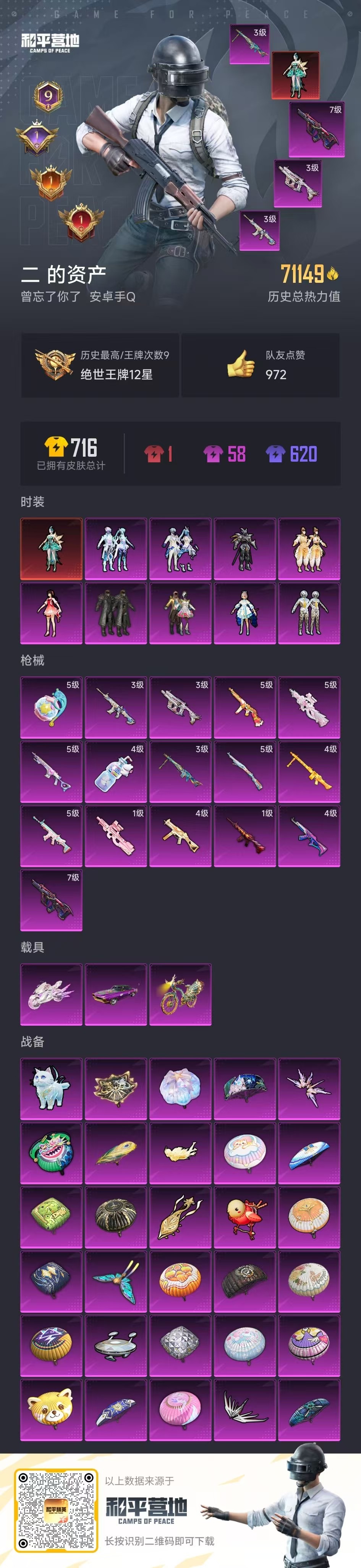 - PX_2109909- 安卓微信-32王牌印记-有战神框-13粉装-13特效枪-4载具-热力值-274套装-368枪皮-11卓越印记-10传奇印记 【13粉装】,梦幻火箭,零号机款机体服,怪诞乔克,幻彩电音,千金淑猫,水曜玄武,碧影闪光,赤焰黑爵,紫电风暴,俏皮狐尾,银刃赛罗,炙焰红王,呆萌星弥 【13特效枪】AKM-幽焰骑士-5级 AKM-梦之光华-5级 SCAR-L-锦绣绵绵-5级 SCAR-