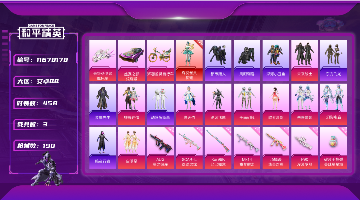 [11678178]1红装 9粉装 16特效枪 3载具 9印记 可二次 可修改实名 连体王者 身法装备:都市猎人,暗影哥特(红眼罩),萌熊伴侣背包(粉熊背包) 优质装备:辉羽雀灵-初翊,二级辉羽雀灵-初翊,辉羽雀灵自行车,虚妄之影(炫耀紫),最终圣卫者摩托车,都市猎人,萌熊伴侣背包(粉熊背包),蝶舞迷情,未来战士,AUG星之彼岸,AKM梦之光华,M416风花雪月,洛天依,UMP45启明星,P90粉樱探戈,MG3酷泡奶龙,SCAR-L-锦绣绵绵,七级AUG-星之彼岸,MK14-甜梦熊击,MG3-辉羽雀灵,烟雾弹-甜梦果泡,幻彩电音,Vector-最终圣卫者,P90-冷漠罗丽,汤姆逊-热量炸弹,破片手榴弹-美味星星糖,M416-灵猫魔法师,Kar98K-巳巳如意 热门装扮:飓风飞鹰,千面幻镜,启明星,歌者泠鸢,未来歌姬,暗夜行者,动感兔斯基,鹰眼刺客,梦魇先生,深海小丑鱼,东方飞龙,都市猎人 五级特效枪:五级Kar98K-巳巳如意,五级P90-冷漠罗丽,五级汤姆逊-热量炸弹,五级破片手榴弹-美味星星糖,五级MK14-甜梦熊击,五级SCAR-L-锦绣绵绵 四级特效枪:四级烟雾弹-甜梦果泡,四级UMP45-启明星,四级MG3-酷泡奶龙,四级AKM-梦之光华 三级特效枪:三级Vector-最终圣卫者,三级M416-灵猫魔法师,三级MG3-辉羽雀灵 一级特效枪:一级P90-粉樱探戈,一级M416-风花雪月 紫色装扮:田园牧歌,轻风白浪,和煦暖阳,SS22特训,白啸长虹,SS23特训,幻彩翩翩,妙红点点,白兰地假日,苍岚星,娇憨猪猪,萌趣咩咩,SS21特训,熠彩粉晶,紫芒星,SS31特训套装,虚空漩涡,冰川特警,冷焰舞者,云朵鹅,彩虹兔,雪绒豹,SS33特训套装,青涩时光,顶瓜瓜,诡诞巡游,混沌火种,SS20特训,暗夜傀儡,微雨春柳,猎梦纪元,粉团憨憨,豚鼠丹丹,软羊咩咩,甜心亚梦,虚音幻奏,瑞龙福将,团圆交子,SS17特训,都市漫游者,酷潮明星,长空猛禽,雪鹰学院,霓虹街区,青年教官,荷畔雨呱,缤纷果语,耀眼新星,蓝彩潮人,蓝色守护者,虎虎生威吉莉,蜜露汐语,飞行日记,魅力单车,鹤鸣,麻辣教官,龙的传人,龟仙人,海岛探路者,夏日倾情,完美偶像,帅气教官,幻世战舞者,探宝勇士,空岛之星,牛气冲天,牛气满满,猛禽,异域银装,玉兔迎春,竞技名士,暗影哥特(红眼罩),惊鸿侠骨,SS24特