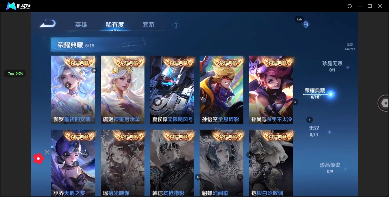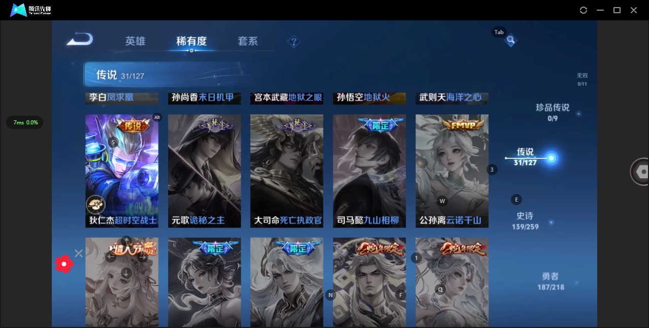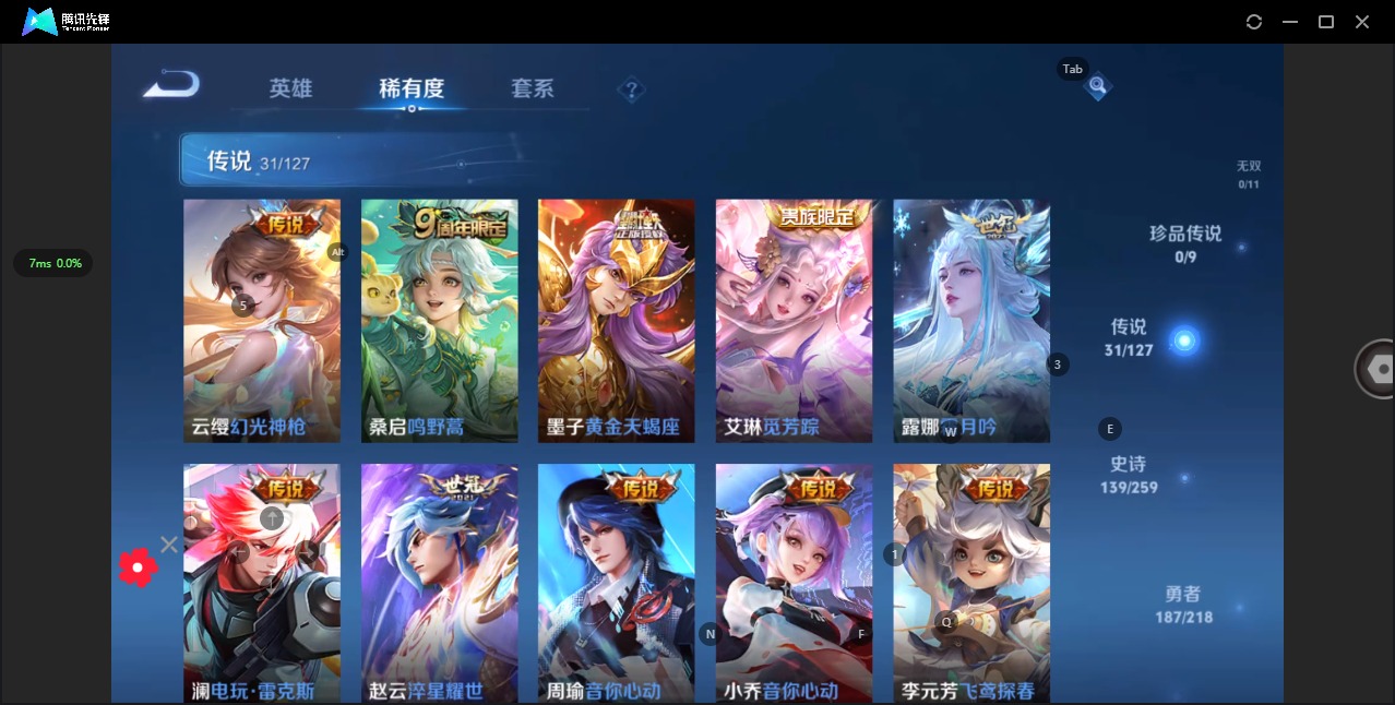 - [12297207]V7 2典藏 13传说 125英雄 199皮肤 可修改实名 优质装备:鸣剑·曳影,弑枪猎影(韩信典藏),冠军飞将,云鹰飞将(小将军),炽阳神光,一念神魔,地狱之眼,无双飞将,电玩·雷克斯,澜逐花归海 珍宝阁皮:蔷薇恋人 限定皮:愿照·九州拓(澜年限),愿照·山河定(司空震年限),陌上桑,鸣野蒿,夏侯惇霜北刀,傲雪梅枪,诗剑行,五谷丰年,百木心枪,山海·玄木吟(马可年限) 史诗皮:器灵·浮梦炉,化蝶舞,谪仙醉月,龙之律动,百相守梦-周瑜,茶境仙,撼地雄心,破空之剑,蒙犽顽岩魄,埋骨钱,琥珀纪元伽罗,蔬乡物语(鲁班七号),曹操夜都魔契,百相守梦-黄忠,织梦人,紫霞仙子,苍穹之光,黄金分割率,特工魅影,千年之狐,江河有灵,百解令(蒙犽),高渐离燃音魔法,青蛇,偶像歌手,电玩·爆裂旋风,百相守梦(刘备),暗夜猫娘,末日机甲-吕布,猫狗日记-孙策,猫狗日记-大乔,乱世虎臣,节奏热浪,修罗,女仆咖啡,水果甜心,天才门将,星夜王子,功夫厨神,暗隐猎兽者,幽灵船长,鬼剑武藏,暗渊魔法,地狱岩魂,纤云弄巧,拒霜思,乘风破浪,逐浪之夏,水晶猎龙者,曙光守护者,箭羽风息,金属风暴,圣诞恋歌,鹰眼统帅,魅力维加斯,赏金猎手,未来纪元-赵云