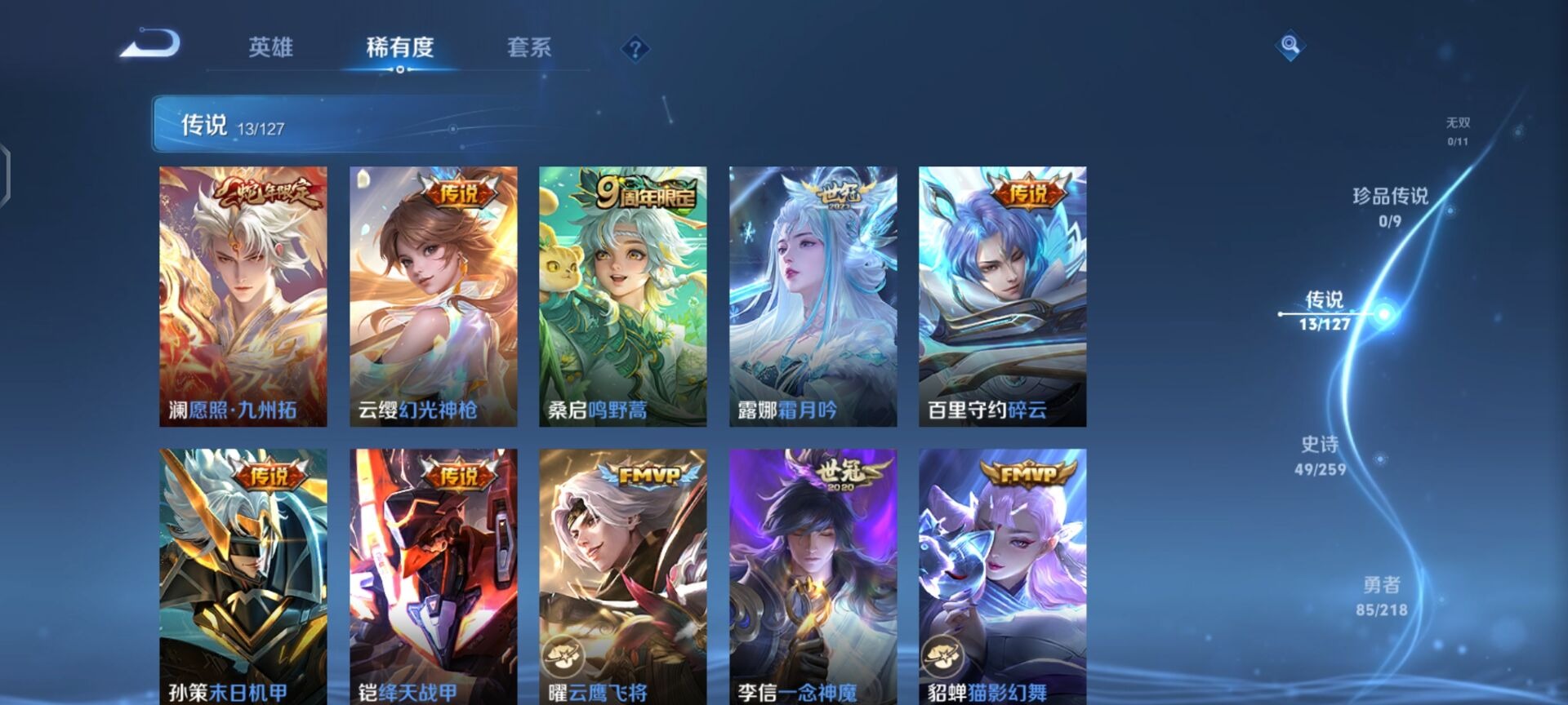 - [11818491]V7 10传说 124英雄 148皮肤 可修改实名 优质装备:冠军飞将,云鹰飞将(小将军),久胜战神,一念神魔,云霓雀翎,地狱火,挚爱之约 传说皮:幻光神枪 珍宝阁皮:优雅恋人 限定皮:凤求凰(白切鸡),武陵仙君(小桃花),傲雪梅枪,冰锋战神,梁祝,李小龙,逐梦之影,孙行者,猪悟能,大圣娶亲 史诗皮:紫霞仙子,白龙吟,千年之狐,晚萤,节奏热浪,修罗,女仆咖啡,水果甜心,星夜王子,暗隐猎兽者,幽灵船长,鬼剑武藏,地狱岩魂,繁星吟游(呼啦呼啦),拒霜思,缤纷独角兽,乘风破浪,逐浪之夏,水晶猎龙者,曙光守护者,原初追逐者,圣诞狂欢,鹰眼统帅,魅力维加斯,赏金猎手,无心