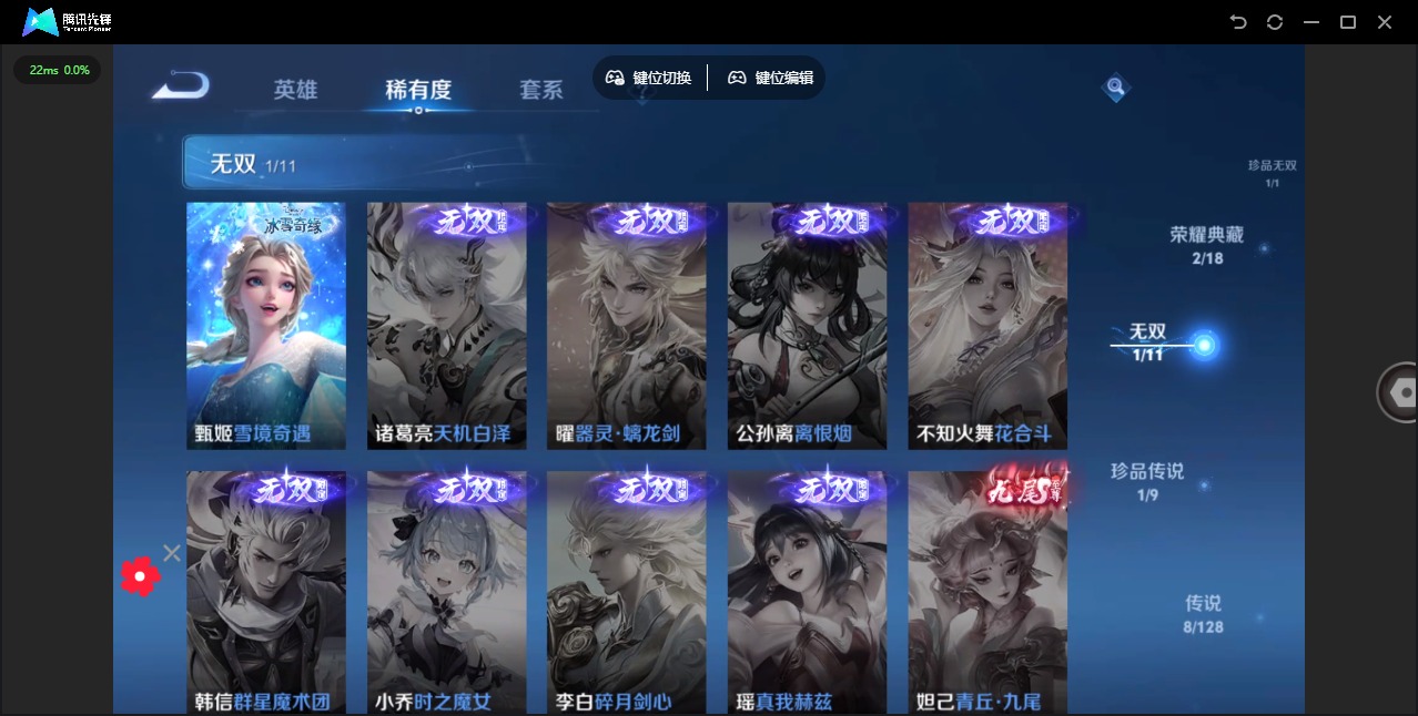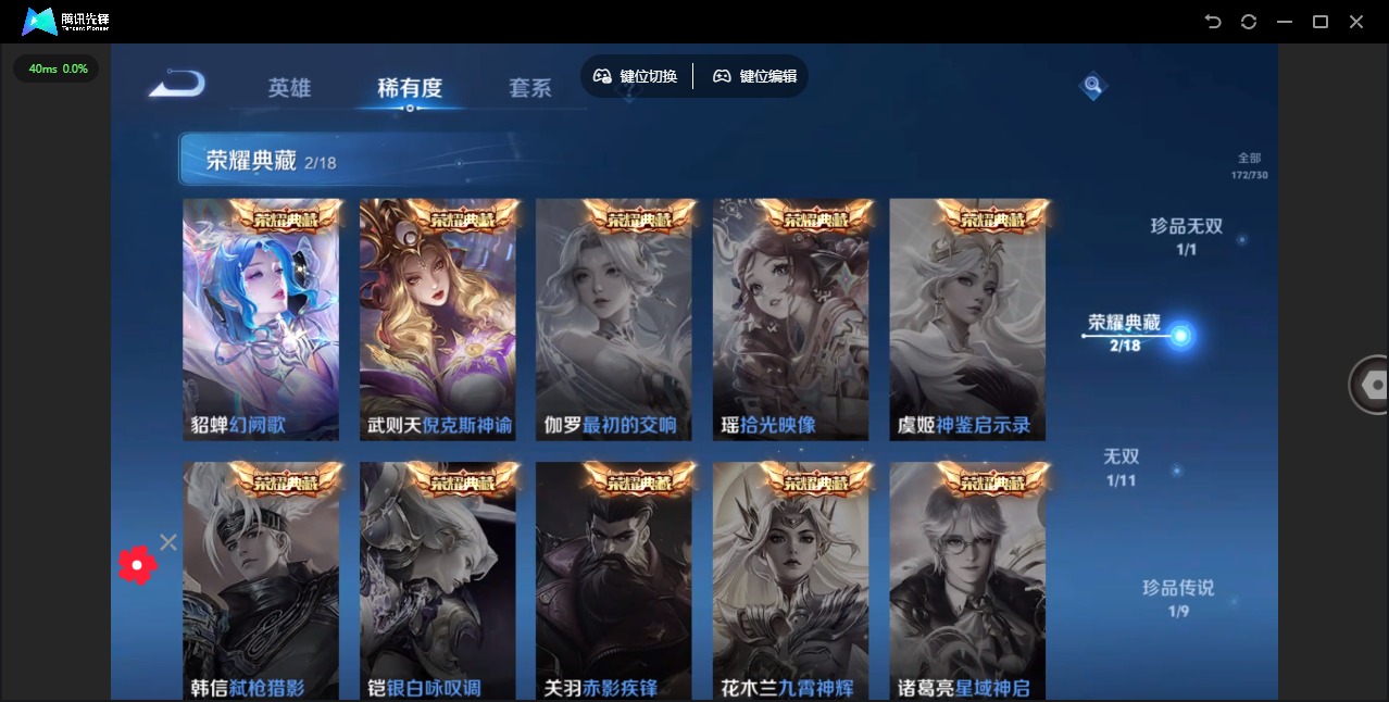 - [11866529]V9 2典藏 33传说 125英雄 462皮肤 可修改实名 优质装备:鸣剑·曳影,拾光映像(瑶典藏),黄金射手座,云鹰飞将(小将军),绛天战甲(鸡嘴战神),久胜战神,炽阳神光,末日机甲-孙尚香(绿蚂蚱),仲夏夜之梦(大飞蛾),音你心动-小乔,胖达荣荣,李逍遥,超时空战士-狄仁杰,碎云,浮生妄,鹤羽星尊,妄想奇谈,黄金天蝎座,千山共赴,涂山容容 传说皮:云诺千山,铠冥王哈迪斯,续相思,星之鸣奏,祥瑞亨通,幻光神枪 珍宝阁皮:妄想食味,胡桃夹子,女武神 限定皮:愿照·九州拓(澜年限),愿照·山河定(司空震年限),愿照·千秋盛(女娲年限),逐霄战戟,鸣野蒿,至尊宝,凤求凰(白切鸡),凤凰于飞,傲雪梅枪,绯月行,魔法小厨娘,时雨天司(水龙头),神威(电光马子),飞衡(韩信年限),遇见飞天,高山流水,诗剑行,降魔,五谷丰年,天狼运算者,梁祝,御风骁将(吕布年限),龙胆,烈魂,天狼溯光者,逐梦之音,祈雪灵祝(雪兔子),天狼绘梦者,李小龙,逐梦之影,朱雀志(守约年限),孙行者,猪悟能,大圣娶亲,引擎之心,青春决赛季,乒乒小将,蜜橘之夏,玉兔公主,时之奇旅-妲己,神器·万象笔 史诗皮:鸭鸭历险记-刘禅,苍鳞隐世,器灵·浮梦炉,糖绘人间,绮世丹青,瑰影绮梦,化蝶舞,灵蛊蚀心,星界战将,龙之律动,雪豹·霜爪,藏狐·褐绒,布丁狗之誓,百相守梦-周瑜,戍鼓铭心,茶境仙,怒海争锋,破空之剑,涂山红红,东方月初,蒙犽顽岩魄,芈月浮光幕影,琥珀纪元伽罗,上官婉儿群星魔术团,蔬乡物语(鲁班七号),超元猎域,百相守梦-百里守约,星界特工,百相守梦-黄忠,织梦人,紫霞仙子,苍穹之光,电玩小子(小书包),白龙吟,黄金分割率,特工魅影,千年之狐,江河有灵,鹤归松栖(赵怀真),真我赫兹(百里守约),魅语,百解令(蒙犽),高渐离燃音魔法,蒙恬荣光圣徽,无限星赏官,冰冠公主,青蛇,偶像歌手,白蛇,晚萤,电玩·爆裂旋风,暗夜猫娘,末日机甲-吕布,猫狗日记-孙策,猫狗日记-大乔,时之恋人-孙尚香,乱世虎臣,节奏热浪,修罗,女仆咖啡,摇滚巨星,水果甜心,绅士熊喵,天才门将,星夜王子,心灵骇客,功夫厨神,德古拉伯爵,暗隐猎兽者,幽灵船长,鬼剑武藏,暗渊魔法,心灵战警,乐园奇幻夜,天秀·启明,舞动绿茵,地狱岩魂,诗语江南,纤云弄巧,繁星吟游(呼啦呼啦),拒霜思,缤纷独角兽,乘风破浪,逐浪之夏,龙鼓争鸣,月团寄思,水晶猎