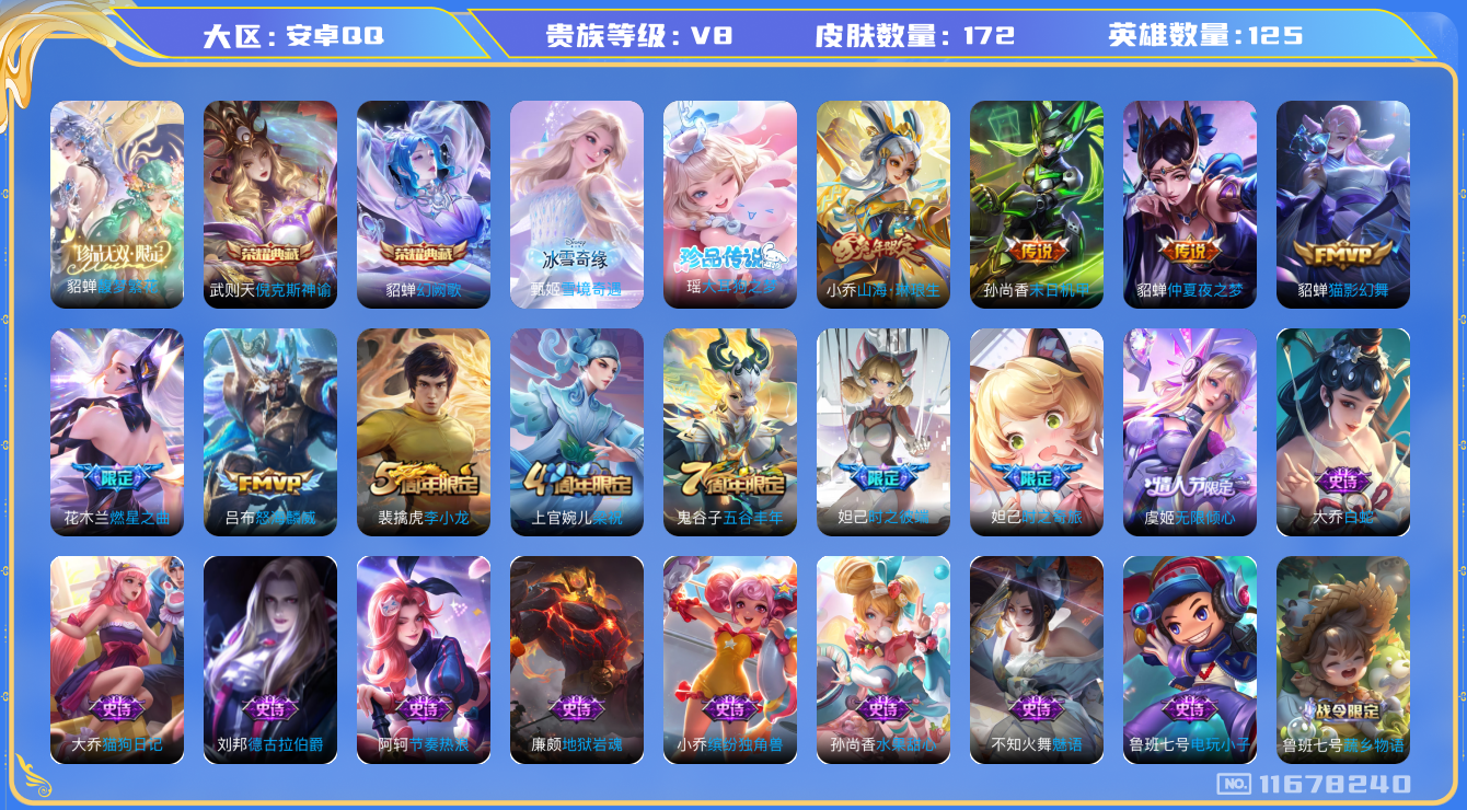 [11678240]V8 2典藏 1珍品无双 1无双 1珍品传说 8传说 125英雄 172皮肤 典藏英雄武则天 女号 可修改实名 优质装备:馥梦繁花,倪克斯神谕(宇宙婆娘),幻阙歌(貂蝉典藏),雪境奇遇-甄姬,大耳狗之梦,猫影幻舞,末日机甲-孙尚香(绿蚂蚱),仲夏夜之梦(大飞蛾),山海·琳琅生(小乔年限),燃星之曲 珍宝阁皮:女武神 限定皮:时之彼端,无限倾心-虞姬,怒海麟威,五谷丰年,梁祝,李小龙,时之奇旅-妲己 史诗皮:鸭鸭历险记-刘禅,龙之律动,蔬乡物语(鲁班七号),乘龙·聚宝船(安琪拉年限),电玩小子(小书包),魅语,偶像歌手,白蛇,龙骑士(小龙虾),猫狗日记-大乔,节奏热浪,女仆咖啡,摇滚巨星,水果甜心,绅士熊喵,心灵骇客,功夫厨神,德古拉伯爵,鬼剑武藏,心灵战警,舞动绿茵,地狱岩魂,诗语江南,纤云弄巧,繁星吟游(呼啦呼啦),缤纷独角兽,金属风暴,圣诞狂欢,圣诞恋歌,鹰眼统帅,魅力维加斯,未来纪元-赵云