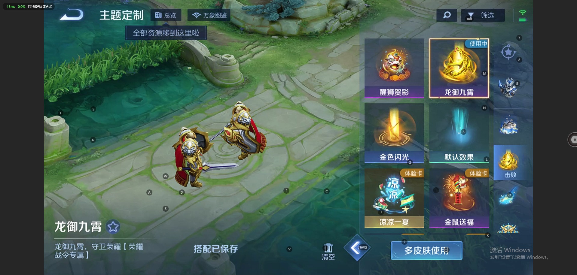 伽罗天狼溯光者,后羿辉光之辰,露娜一生所爱,裴擒虎李小龙,裴擒虎天狼狩猎者,上官婉儿梁祝,孙悟空大圣娶亲,孙悟空美猴王,韩信逐梦之影,百里守约朱雀志