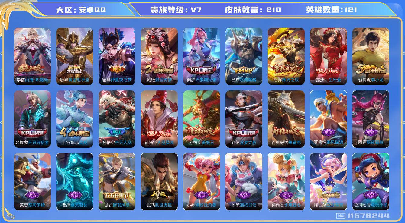 [11678244]V7 5传说 121英雄 210皮肤 可修改实名 优质装备:黄金射手座,仲夏夜之梦(大飞蛾),山海·炽霜斩(李信年限) 珍宝阁皮:玩趣恶龙 限定皮:齐天大圣,怒海麟威,游园惊梦,梁祝,天狼狩猎者,天狼溯光者,李小龙,逐梦之影,朱雀志(守约年限),辉光之辰,一生所爱,大圣娶亲,美猴王 史诗皮:怒海争锋,电玩小子(小书包),黄金分割率,千年之狐,电玩·爆裂旋风,江河有灵,百解令(蒙犽),蒙恬荣光圣徽,偶像歌手,暗夜猫娘,末日机甲-吕布,猫狗日记-孙策,乱世虎臣,女仆咖啡,水果甜心,星夜王子,功夫厨神,幽灵船长,鬼剑武藏,舞动绿茵,纤云弄巧,繁星吟游(呼啦呼啦),拒霜思,缤纷独角兽,乘风破浪,逐浪之夏,水晶猎龙者,箭羽风息,金属风暴,原初追逐者,鹰眼统帅,魅力维加斯,奇遇舞章,未来纪元-赵云