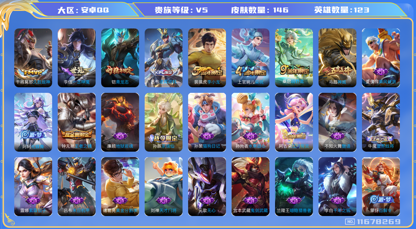 [11678269]V5 3传说 123英雄 146皮肤 可修改实名 优质装备:久胜战神,一念神魔 珍宝阁皮:妄想食味 限定皮:逐霄战戟,鸣野蒿,神威(电光马子),青龙志(铠年限),梁祝,李小龙 史诗皮:化蝶舞,星界战将,茶境仙,蒙犽顽岩魄,紫霞仙子,黄金分割率,特工魅影,千年之狐,江河有灵,魅语,百解令(蒙犽),晚萤,末日机甲-吕布,猫狗日记-孙策,女仆咖啡,水果甜心,天才门将,星夜王子,功夫厨神,暗隐猎兽者,鬼剑武藏,心灵战警,乐园奇幻夜,地狱岩魂,纤云弄巧,乘风破浪,原初追逐者,鹰眼统帅,王者之锤,无心,未来纪元-赵云