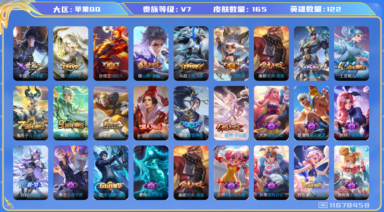 [11678458]V7 8传说 122英雄 165皮肤 可修改实名 女号 优质装备:炽阳神光,一念神魔,地狱火,飞鸢探春,无双飞将,山海·苍雷引(电光曜子) 珍宝阁皮:胡桃夹子 限定皮:愿照·岁时盈(虞姬年限),逐霄战戟,鸣野蒿,傲雪梅枪,五谷丰年,梁祝,孙行者,大圣娶亲,寅虎·御盾(廉颇年限) 史诗皮:化蝶舞,蔬乡物语(鲁班七号),百相守梦-黄忠,特工魅影,电玩·爆裂旋风,江河有灵,百解令(蒙犽),偶像歌手,猫狗日记-孙策,猫狗日记-大乔,节奏热浪,女仆咖啡,水果甜心,绅士熊喵,功夫厨神,暗隐猎兽者,幽灵船长,鬼剑武藏,纤云弄巧,拒霜思,缤纷独角兽,乘风破浪,逐浪之夏,水晶猎龙者,曙光守护者,金属风暴,圣诞狂欢,鹰眼统帅,魅力维加斯,赏金猎手,寅虎·御盾,无心,未来纪元-赵云