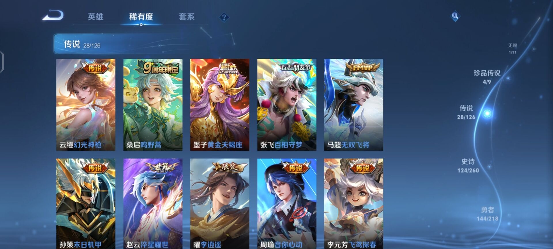 铠绛天战甲,张飞百相守梦,赵云淬星耀世,李信一念神魔,孙策末日机甲,达摩黄金狮子座,镜炽阳神光,周瑜音你心动,貂蝉猫影幻舞,孙悟空零号·赤焰,曜李逍遥,马超无双飞将,李元芳飞鸢探春,墨子黄金天蝎座,虞姬云霓雀翎,云缨幻光神枪