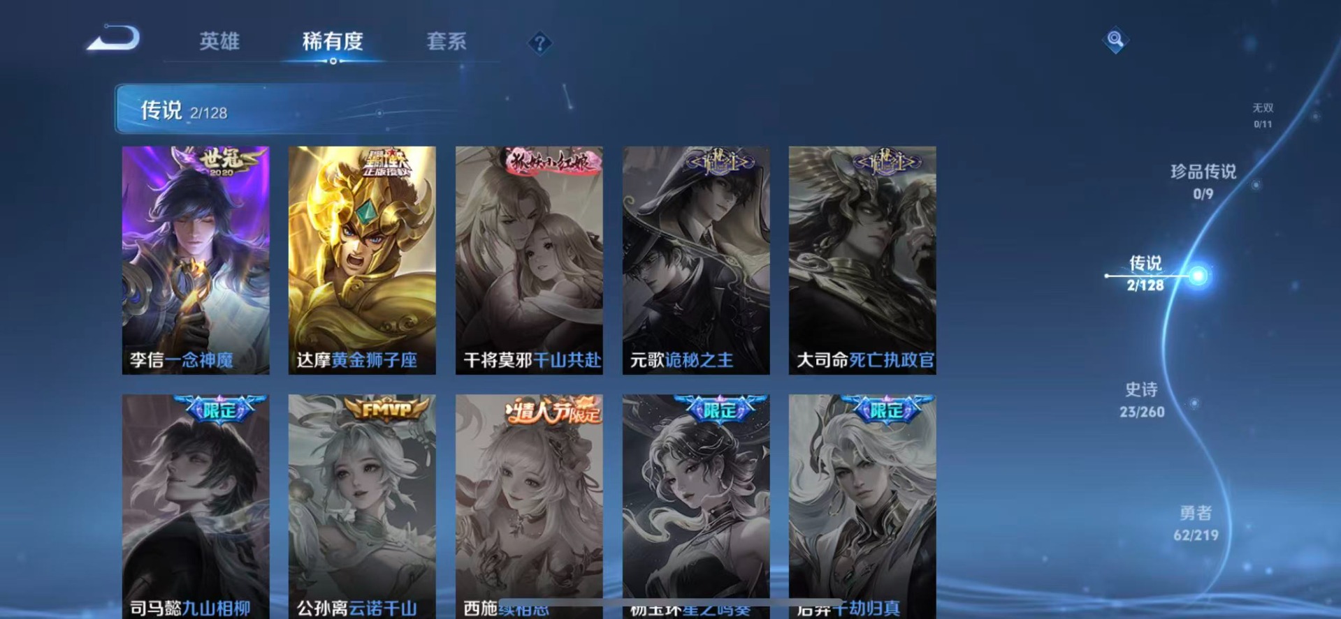 - PX_2096834-安卓Q 【可二次】 英雄数量:125 皮肤数量:305 贵族等级:贵族V9 【星传说 幽冥之眼】珍品无双1 无双限定1 荣耀典藏3 珍品传说3 传说品质30 史诗品质80貂蝉馥梦繁花 器灵·螭龙剑 九霄神辉 全息碎影 无限飓风号 时之奇旅孙策 器灵·落星盏 兔狲·蓬尾 祈雪灵祝 愿照·千秋盛 愿照·福禄聚 愿照·岁时盈 续相思 乞巧织情 海洋之心 仲夏夜之梦 音你闪耀 一念神