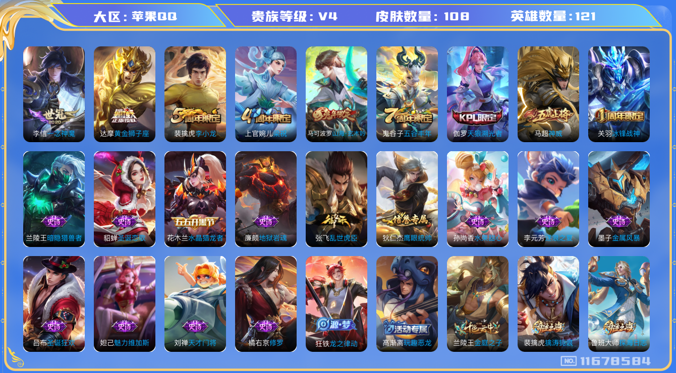 - PX_2087264-实名: 可修改 贵族等级: V5 英雄数: 124 皮肤数: 143 传说皮: 久胜战神 限定皮: 梁祝,飞衡,凤求凰,至尊宝,傲雪梅枪,五谷丰年