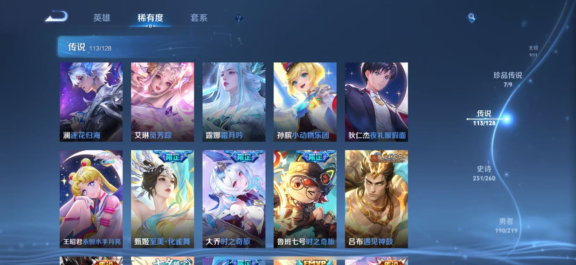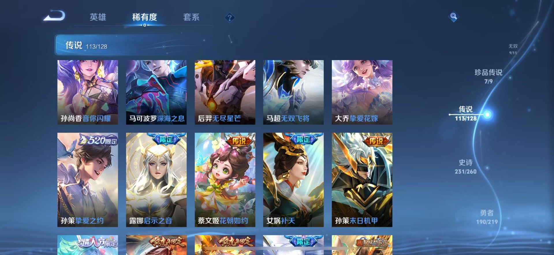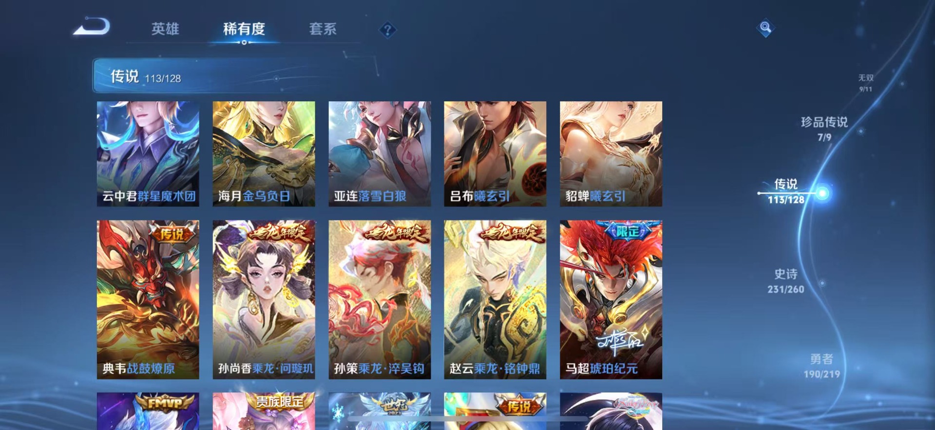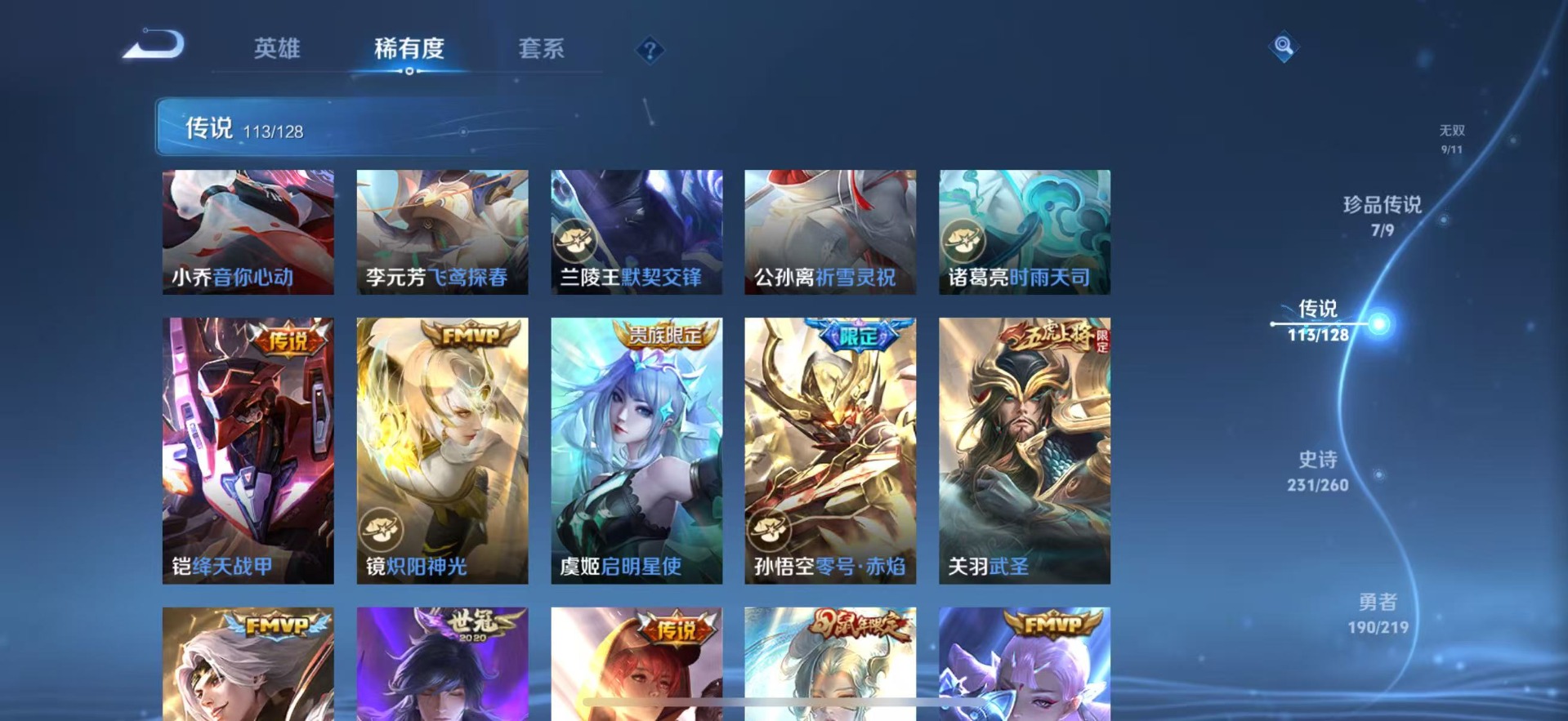 金蝉唐三藏,夏侯惇匿光决锋者,黄忠烈魂,苏烈玄武志,小乔纯白花嫁,孙尚香异界灵契,不知火舞绯月行,牛魔奔雷神使,项羽霸王别姬,露娜启示之音,露娜一生所爱,庄周玄嵩,镜匿光追影者,庄周云端筑梦师,周瑜真爱至上,诸葛亮时雨天司,杨玉环寅虎·心曲,司空震愿照·山河定,貂蝉逐梦之音,裴擒虎李小龙,裴擒虎天狼狩猎者,裴擒虎寅虎·赤拳,东皇太一逐梦之光,上官婉儿神器·万象笔,上官婉儿天狼绘梦者,花木兰默契交锋,花木兰瑞麟志,花木兰青春决赛季,马可波罗逐梦之星,马可波罗山海·玄木吟,马可波罗深海之息,猪八戒猪悟能,孙悟空孙行者,孙悟空大圣娶亲,芈月白晶晶,孙悟空至尊宝,云中君时之祈愿,韩信傲雪梅枪,韩信逐梦之影,百里守约朱雀志,墨子降魔,澜愿照·九州拓,虞姬霸王别姬,虞姬愿照·岁时盈,王昭君凤凰于飞,嫦娥如梦令,王昭君星穹之声,王昭君映山客,橘右京枫霜尽,大乔白鹤梁神女,甄姬幽恒,甄姬女儿国国王,甄姬至美·化雀舞,铠青龙志,廉颇寅虎·御盾,伽罗天狼溯光者,伽罗太华,张飞虎魄,赵云百木心枪,赵云龙胆,孙膑天狼运算者,孙膑寅虎·展翼,干将莫邪冰霜恋舞曲,鲁班七号乒乒小将,鲁班七号寅虎·瑞焰,后羿无尽星芒,吕布御风骁将,后羿如梦令,后羿辉光之辰,兰陵王默契交锋,公孙离祈雪灵祝,公孙离玉兔公主,公孙离蜜橘之夏,鲁班大师匿光启智者,李白诗剑行,安琪拉魔法小厨娘,艾琳陌上桑,西施至美·乘鲤谣,桑启鸣野蒿,女娲补天,女娲愿照·千秋盛,百里玄策白虎志,马超神威,妲己时之彼端,妲己时之奇旅,妲己愿照·众生和,蔡文姬奇迹圣诞,蔡文姬愿照·福禄聚,瑶时之祈愿,瑶山海·碧波行,娜可露露前尘镜,妲己热情桑巴,关羽武圣,关羽冰锋战神