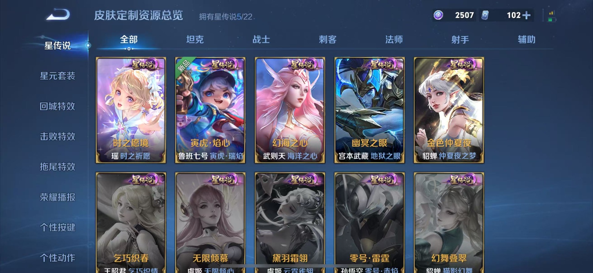 刘备时之恋人,小乔音你心动,李信一念神魔,孙尚香音你闪耀,孙尚香乘龙·问璇玑,露娜霜月吟,庄周牧神诗旅,镜炽阳神光,朵莉亚心动手记,周瑜音你心动,杨玉环星之鸣奏,宫本武藏惊梅引,貂蝉遇见胡旋,裴擒虎祥瑞亨通,貂蝉猫影幻舞,嬴政玄雷天君,张良黄金白羊座,孙悟空零号·赤焰,曜云鹰飞将,曜李逍遥,云中君群星魔术团,百里守约碎云,澜逐花归海,虞姬云霓雀翎,貂蝉曦玄引,王昭君永恒水手月亮,大乔挚爱花嫁,大乔时之奇旅,铠绛天战甲,赵云乘龙·铭钟鼎,孙膑小动物乐团,张飞百相守梦,赵云淬星耀世,干将莫邪久胜战神,典韦战鼓燎原,干将莫邪画中仙,孙策末日机甲,孙策挚爱之约,孙策乘龙·淬吴钩,达摩黄金狮子座,海月金乌负日,王昭君乞巧织情,鲁班七号时之奇旅,吕布曦玄引,吕布遇见神鼓,公孙离记忆之芯,亚连落雪白狼,夏洛特浮生妄,艾琳觅芳踪,西施游龙清影,西施续相思,狄仁杰夜礼服假面,马超琥珀纪元,马超无双飞将,李元芳飞鸢探春,蔡文姬花朝如约,云缨幻光神枪