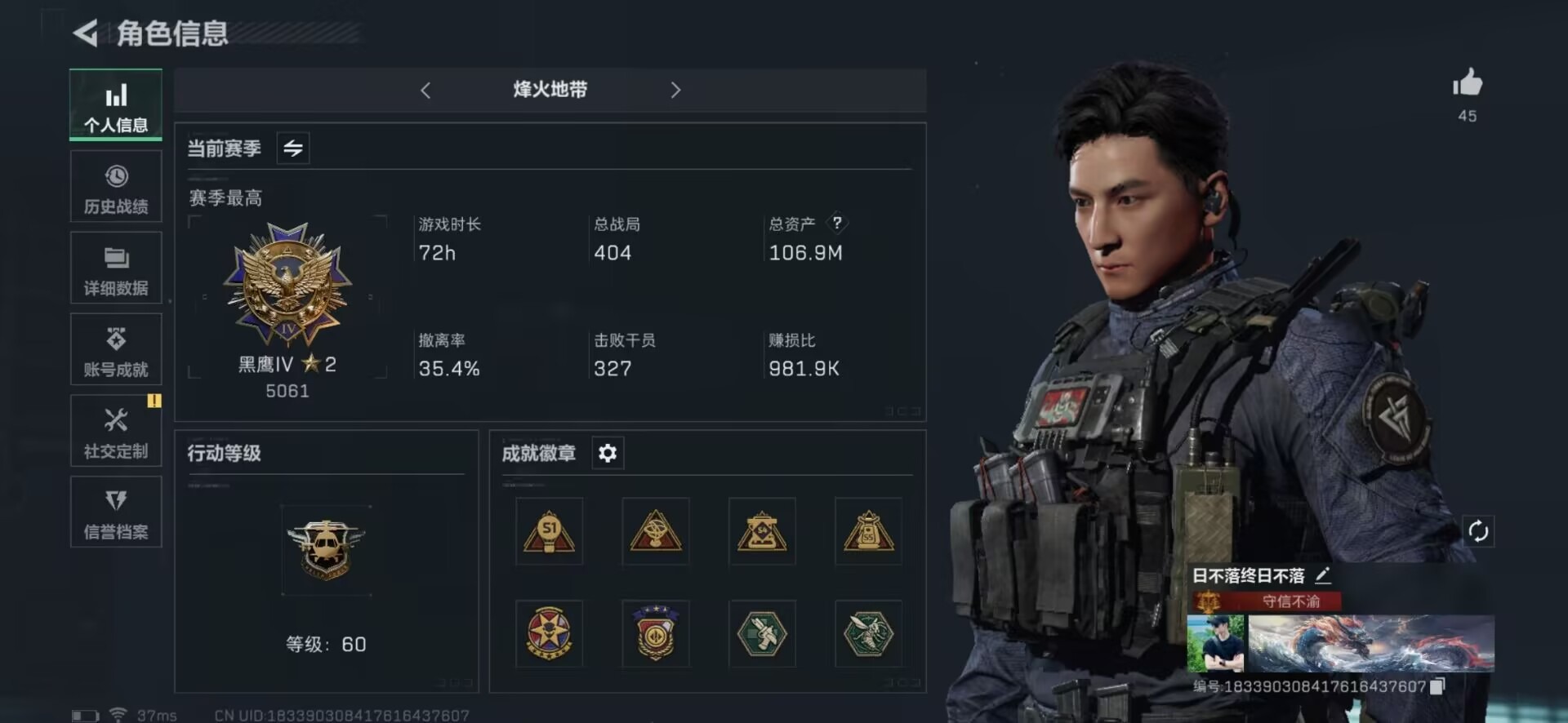 [11678789]总资产:106.9 1干员外观 7传说枪械 顶级安全箱(9.17到期) 可二次 可修改实名 烽火地带段位:黑鹰 全面战场段位:上等兵 哈夫币:1.051 传说武器皮肤:SCAR-H战斗步枪-水墨云图,SMG45冲锋枪-骑士,复合弓-黑-天际线,725双管霰弹枪-送葬人-无题密令,M4A1突击步枪-蚀金玫瑰,P90冲锋枪-神秘艺术,M7战斗步枪-神秘艺术 史诗武器皮肤:SR-3M紧凑突击步枪-英雄,AUG突击步枪-蝮蛇,M700狙击步枪-蝮蛇,PKM通用机枪-蝮蛇,G3战斗步枪-战场英杰,MP5冲锋枪-深海恐惧,勇士冲锋枪-深海恐惧,AKM突击步枪-林中猎手,SVD狙击步枪-暗夜猎手,M16A4突击步枪-竞赛选手,M1014霰弹枪-林中猎手,SV-98狙击步枪-林中猎手,PSG-1射手步枪-无垢,M250通用机枪-囚徒,QBZ95-1突击步枪-曙光,沙漠之鹰-曙光,SCAR-H-猎鳄行动,K416突击步枪-竞技风,Vector冲锋枪-阿萨拉文明,SVD狙击步枪-阿萨拉工艺,S12K霰弹枪-曙光,AS Val突击步枪-刀锋,M700狙击步枪-竞技风,QSZ92G-风林火山,93R-博士 干员外观:骇爪-水墨云图