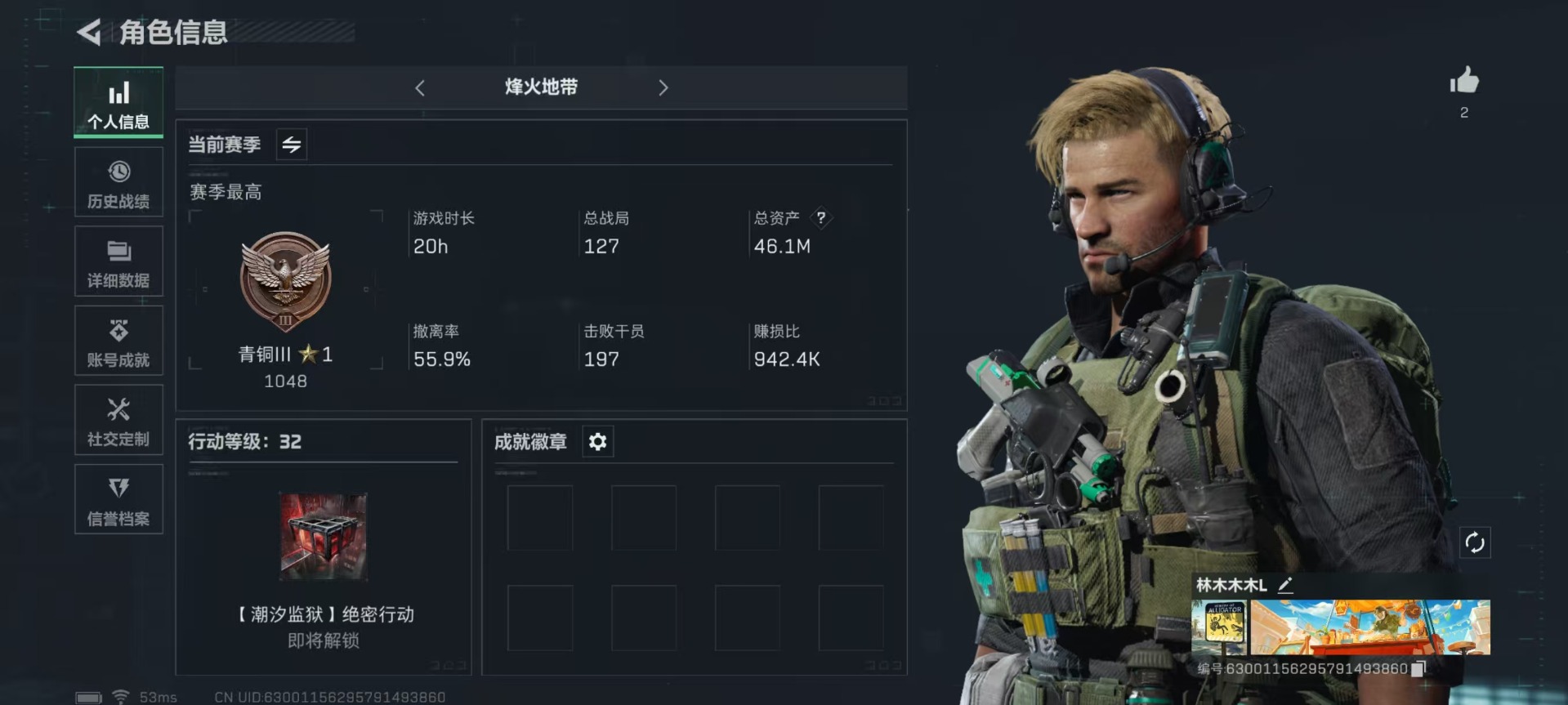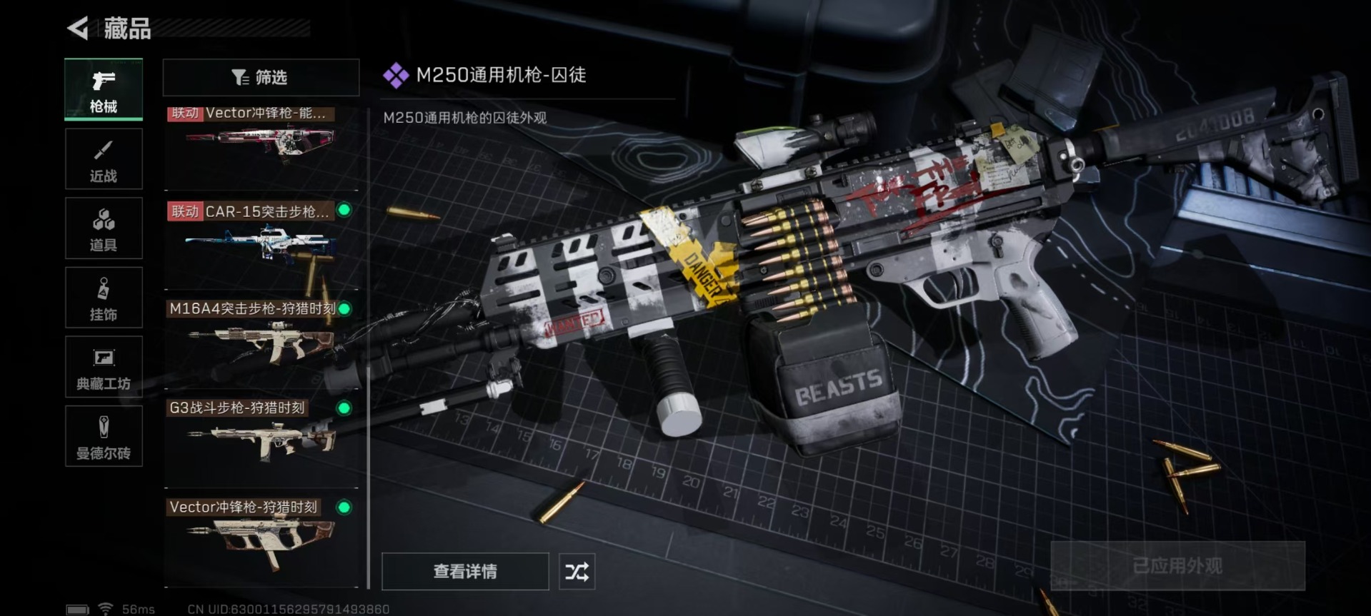[11678842]总资产:46.1M 6传说枪械 哈夫币:30.470K 进阶安全箱(9.16到期) 可二次 可修改实名 烽火地带段位:青铜 全面战场段位:无段位 传说武器皮肤:M16A4突击步枪-狩猎时刻,勇士冲锋枪-能天使-午夜邮差,Vector冲锋枪-狩猎时刻,Vector冲锋枪-能天使-午夜邮差,G3战斗步枪-狩猎时刻,CAR-15突击步枪-阿米娅 史诗武器皮肤:PKM通用机枪-蝮蛇,勇士冲锋枪-深海恐惧,M250通用机枪-囚徒,SV-98狙击步枪-林中猎手,P90冲锋枪-紧急戒备
