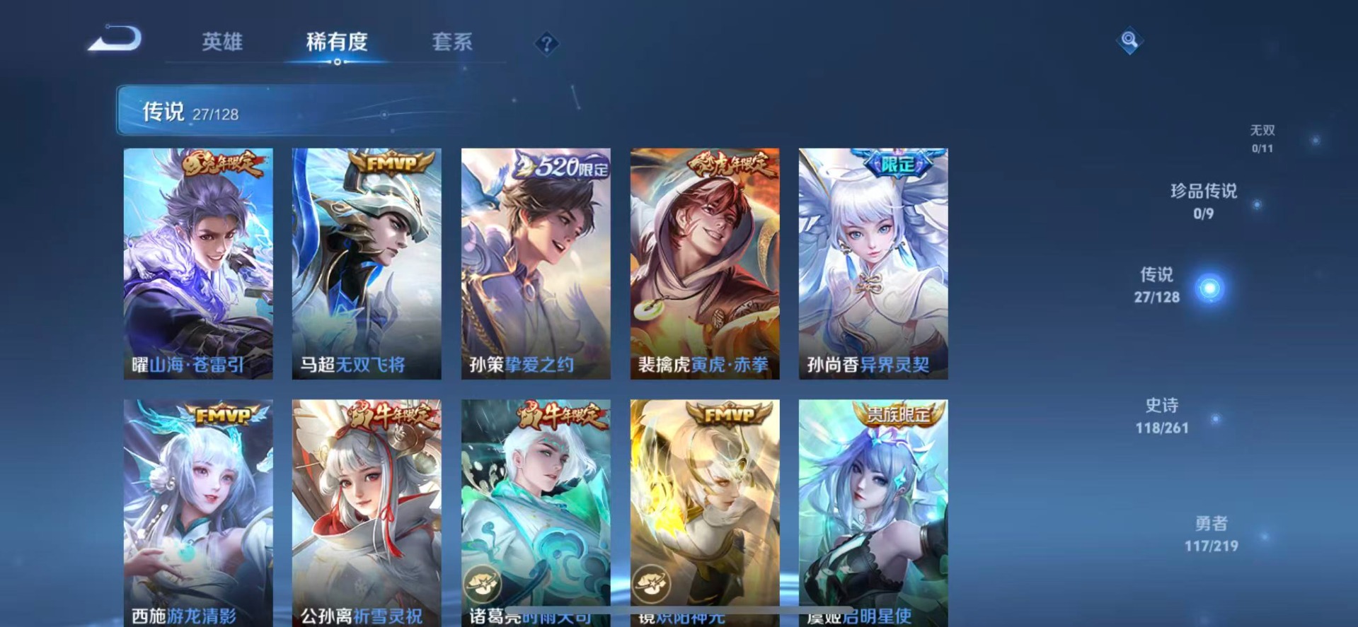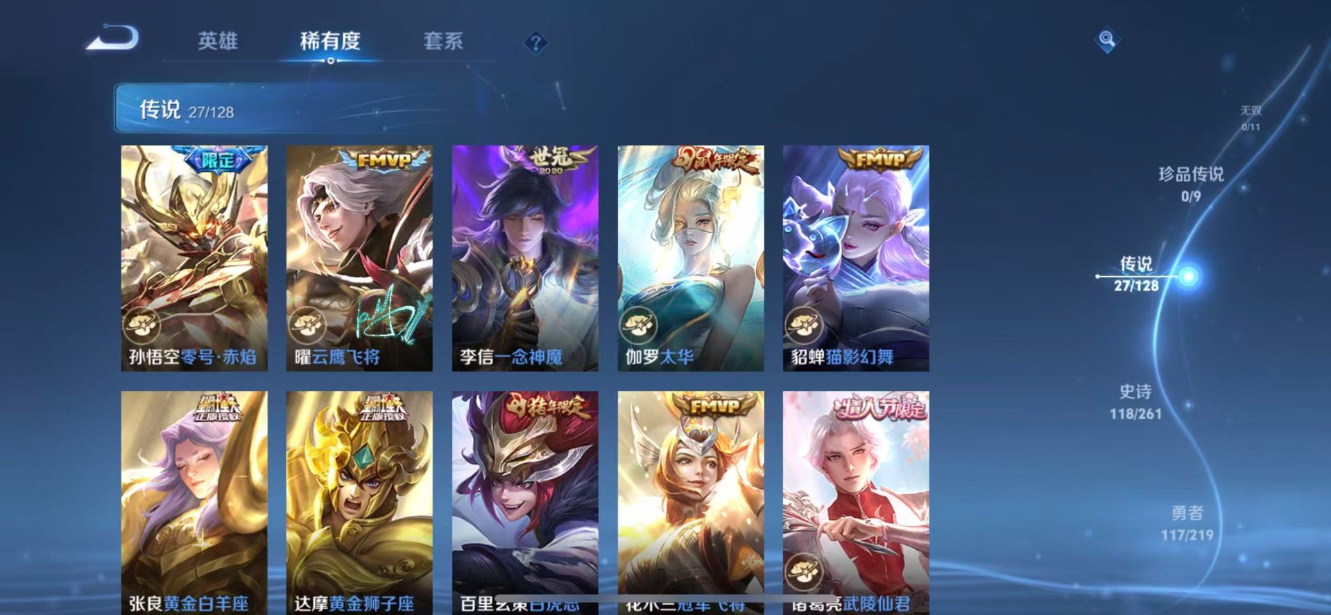 铠青龙志,伽罗太华,赵云百木心枪,孙膑天狼运算者,干将莫邪冰霜恋舞曲,孙尚香异界灵契,吕布御风骁将,后羿辉光之辰,露娜一生所爱,镜匿光追影者,周瑜真爱至上,诸葛亮时雨天司,公孙离祈雪灵祝,公孙离玉兔公主,公孙离蜜橘之夏,裴擒虎李小龙,裴擒虎寅虎·赤拳,上官婉儿梁祝,上官婉儿天狼绘梦者,花木兰默契交锋,花木兰青春决赛季,安琪拉魔法小厨娘,孙悟空孙行者,孙悟空大圣娶亲,孙悟空至尊宝,百里玄策白虎志,马超神威,雅典娜神奇女侠,妲己时之彼端,韩信傲雪梅枪,韩信飞衡,韩信逐梦之影,嫦娥如梦令,关羽冰锋战神