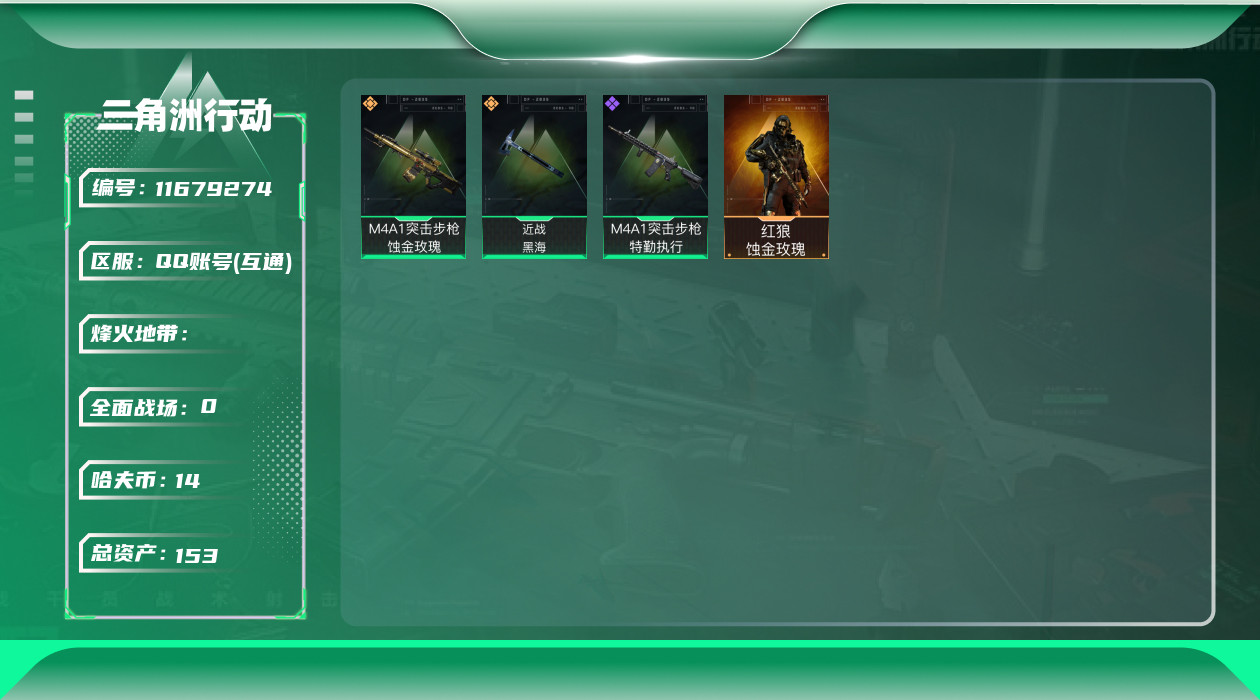 [11679274]可二次 可修改实名 实名:可修改 顶级安全箱(3×3)9.1号到期 总资产:153.6 哈夫币:14.663 传说武器皮肤:近战-黑海,M4A1突击步枪-蚀金玫瑰 史诗武器皮肤:M4A1突击步枪-特勤执行 干员外观:红狼-蚀金玫瑰