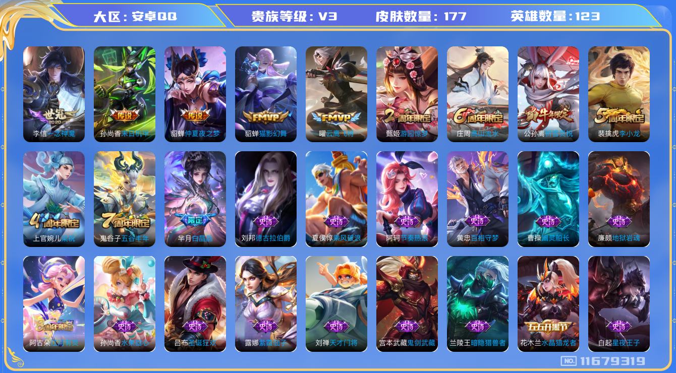 [11679319]V3 6传说 123英雄 177皮肤 可修改实名 优质装备:云鹰飞将(小将军),猫影幻舞,一念神魔,末日机甲-孙尚香(绿蚂蚱),仲夏夜之梦(大飞蛾) 珍宝阁皮:妄想食味,女武神,玩趣恶龙 限定皮:白晶晶,高山流水,五谷丰年,游园惊梦,梁祝,祈雪灵祝(雪兔子),李小龙 史诗皮:百相守梦-黄忠,紫霞仙子,白龙吟,江河有灵,蒙恬荣光圣徽,晚萤,冰冠公主,节奏热浪,修罗,女仆咖啡,水果甜心,天才门将,星夜王子,功夫厨神,德古拉伯爵,暗隐猎兽者,幽灵船长,鬼剑武藏,地狱岩魂,纤云弄巧,繁星吟游(呼啦呼啦),拒霜思,乘风破浪,水晶猎龙者,金属风暴,原初追逐者,圣诞狂欢,鹰眼统帅,魅力维加斯,黎明之约