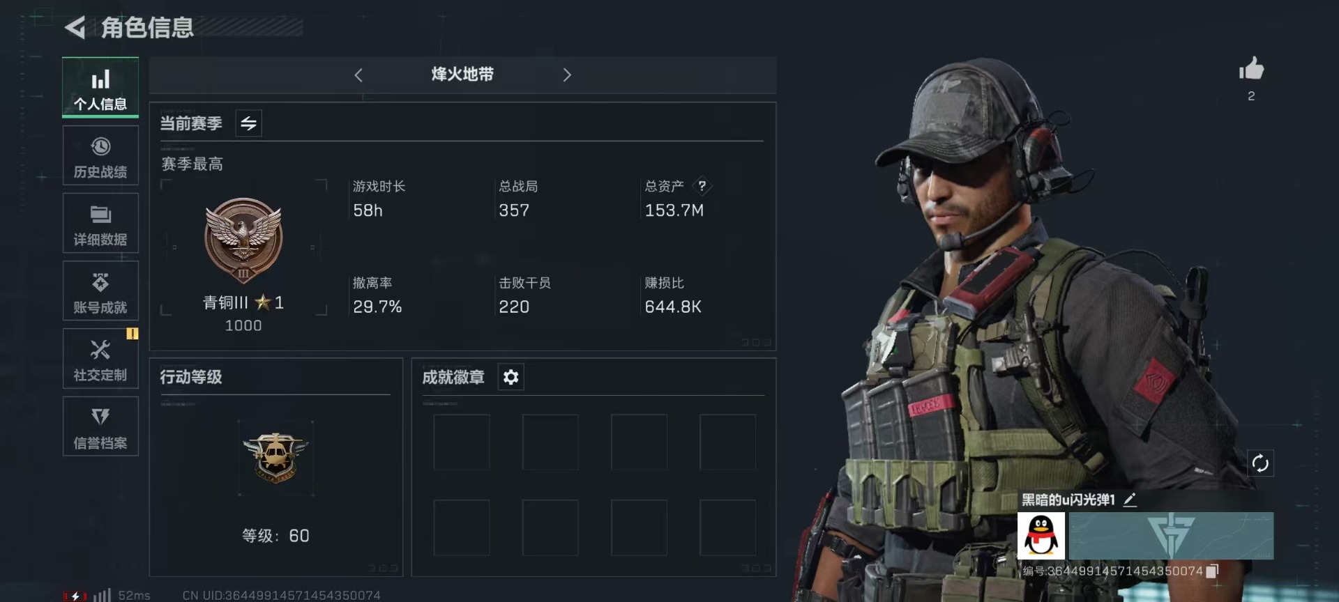 [11679381]总资产:153.7M 2传说枪械 哈夫币:125K 可二次 可修改实名 优质装备:顶级安全箱(3x3) 烽火地带段位:青铜 全面战场段位:无段位 传说武器皮肤:CAR-15突击步枪-阿米娅,勇士冲锋枪-能天使-午夜邮差 史诗武器皮肤:AUG突击步枪-蝮蛇,勇士冲锋枪-深海恐惧,AKM突击步枪-林中猎手,M1014霰弹枪-林中猎手,SV-98狙击步枪-林中猎手,Vector冲锋枪-阿萨拉文明