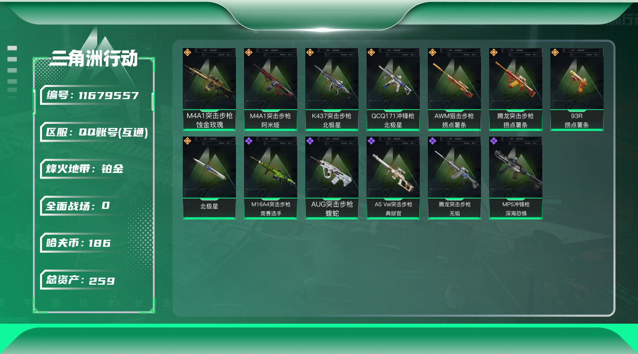 [11679557]总资产:259.1M 1近战传说 8传说枪械 哈夫币:186K 高级安全箱(2×3)9.15号到期 可二次 可修改实名 优质装备:近战-北极星 烽火地带段位:铂金 全面战场段位:列兵 传说武器皮肤:M4A1突击步枪-阿米娅,AWM狙击步枪-捞点薯条,QCQ171冲锋枪-北极星,腾龙突击步枪-捞点薯条,93R-捞点薯条,K437突击步枪-北极星,M4A1突击步枪-蚀金玫瑰 史诗武器皮肤:AUG突击步枪-蝮蛇,M16A4突击步枪-竞赛选手,MP5冲锋枪-深海恐惧,AS Val突击步枪-典狱官,腾龙突击步枪-无垢