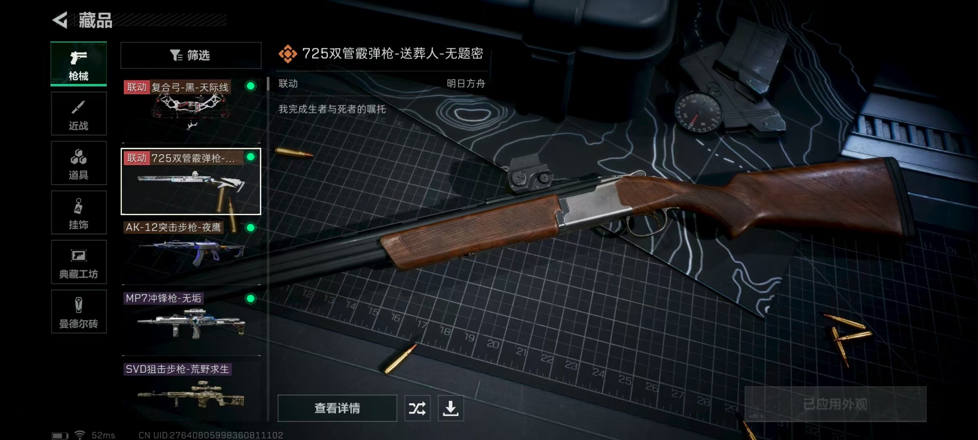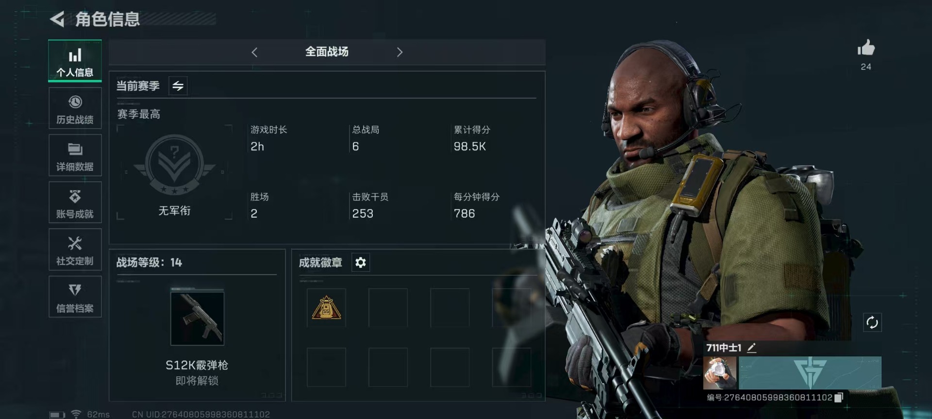 [11679763]可二次 可修改实名 实名:可修改 顶级安全箱(9.17到期) 烽火地带段位:钻石 全面战场段位:无段位 总资产:186.1 哈夫币:3.402 传说武器皮肤:AK-12突击步枪-夜鹰,复合弓-黑-天际线,725双管霰弹枪-送葬人-无题密令 史诗武器皮肤:勇士冲锋枪-私人定制(典藏),SR-25射手步枪-尖端治疗,PKM通用机枪-荒野求生,AS Val突击步枪-尖端治疗,M700狙击步枪-守夜人,Ash-12战斗步枪-守夜人,SR-3M紧凑突击步枪-荒野求生,AKM突击步枪-林中猎手,M16A4突击步枪-竞赛选手,PKM通用机枪-守夜人,SVD狙击步枪-荒野求生,M1014霰弹枪-林中猎手,SV-98狙击步枪-林中猎手,PTR-32突击步枪-英雄,PSG-1射手步枪-无垢,M250通用机枪-囚徒,QBZ95-1突击步枪-曙光 干员外观:无名-夜鹰,露娜-黑·天际线