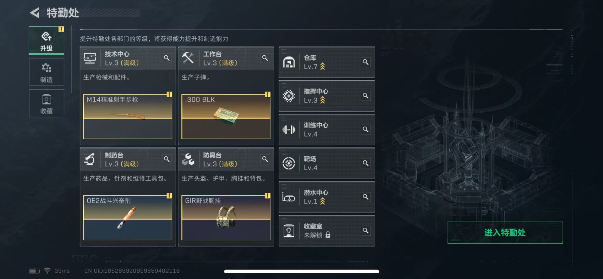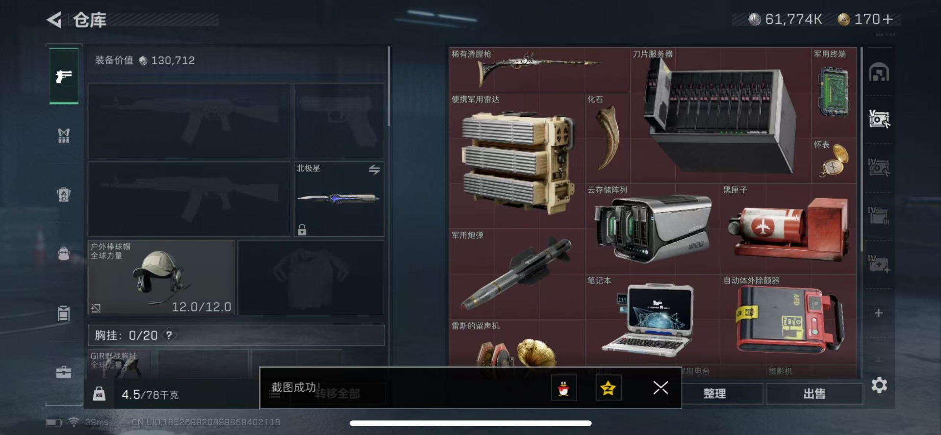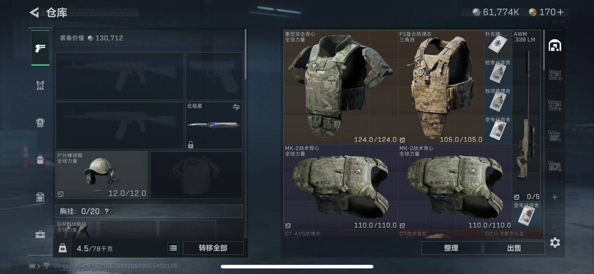 - [10089754]总资产108M,哈夫币3328w,枪皮数量43,战场等级:1 无军衔,行动等级:60 白银,近战-黑鹰,安全箱等时效性道具请以游戏内数据为准;详情请看图