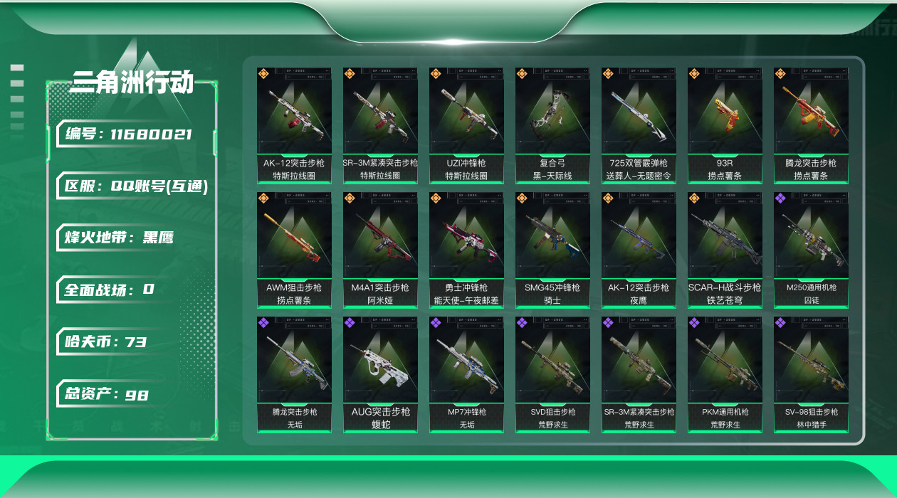 [11680021]总资产:98.5M 1干员外观 13传说枪械 哈夫币:73.122K 高级安全箱(9.17到期) 可二次 可修改实名 烽火地带段位:黑鹰 全面战场段位:列兵 传说武器皮肤:SCAR-H战斗步枪-铁艺苍穹,AK-12突击步枪-夜鹰,SMG45冲锋枪-骑士,M4A1突击步枪-阿米娅,复合弓-黑-天际线,AWM狙击步枪-捞点薯条,腾龙突击步枪-捞点薯条,93R-捞点薯条,AK-12突击步枪-特斯拉线圈,SR-3M紧凑突击步枪-特斯拉线圈,UZI冲锋枪-特斯拉线圈,勇士冲锋枪-能天使-午夜邮差,725双管霰弹枪-送葬人-无题密令 史诗武器皮肤:AUG突击步枪-蝮蛇,M700狙击步枪-蝮蛇,M16A4突击步枪-竞赛选手,PKM通用机枪-荒野求生,SR-3M紧凑突击步枪-荒野求生,SV-98狙击步枪-林中猎手,SVD狙击步枪-荒野求生,M250通用机枪-囚徒,腾龙突击步枪-无垢,MP7冲锋枪-无垢,PSG-1射手步枪-无垢 干员外观:蜂医-送葬人·无题密令(S5)