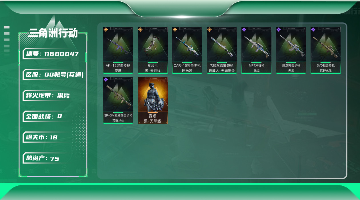 [11680047]总资产:75.8 1干员外观 4传说枪械 顶级安全箱(3×3)9.15号到期 可二次 可修改实名 烽火地带段位:黑鹰 全面战场段位:上等兵 哈夫币:18.098 传说武器皮肤:AK-12突击步枪-夜鹰,复合弓-黑-天际线,CAR-15突击步枪-阿米娅,725双管霰弹枪-送葬人-无题密令 史诗武器皮肤:SR-3M紧凑突击步枪-荒野求生,SVD狙击步枪-荒野求生,腾龙突击步枪-无垢,MP7冲锋枪-无垢 干员外观:露娜-黑·天际线