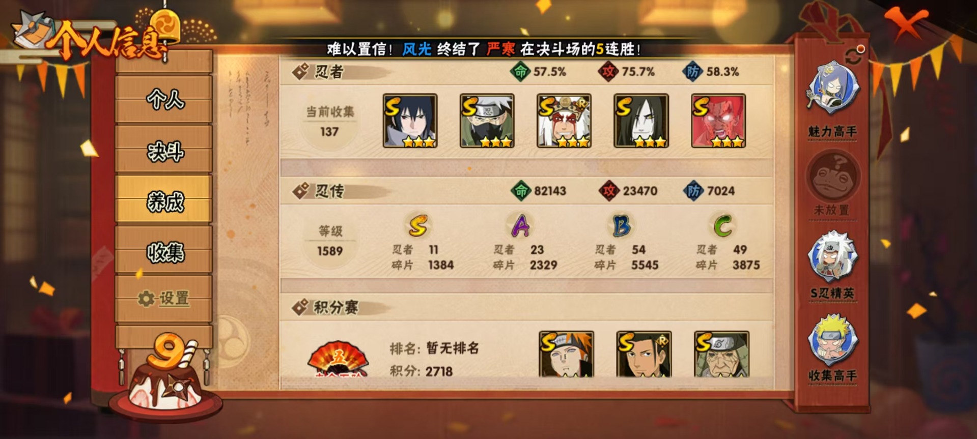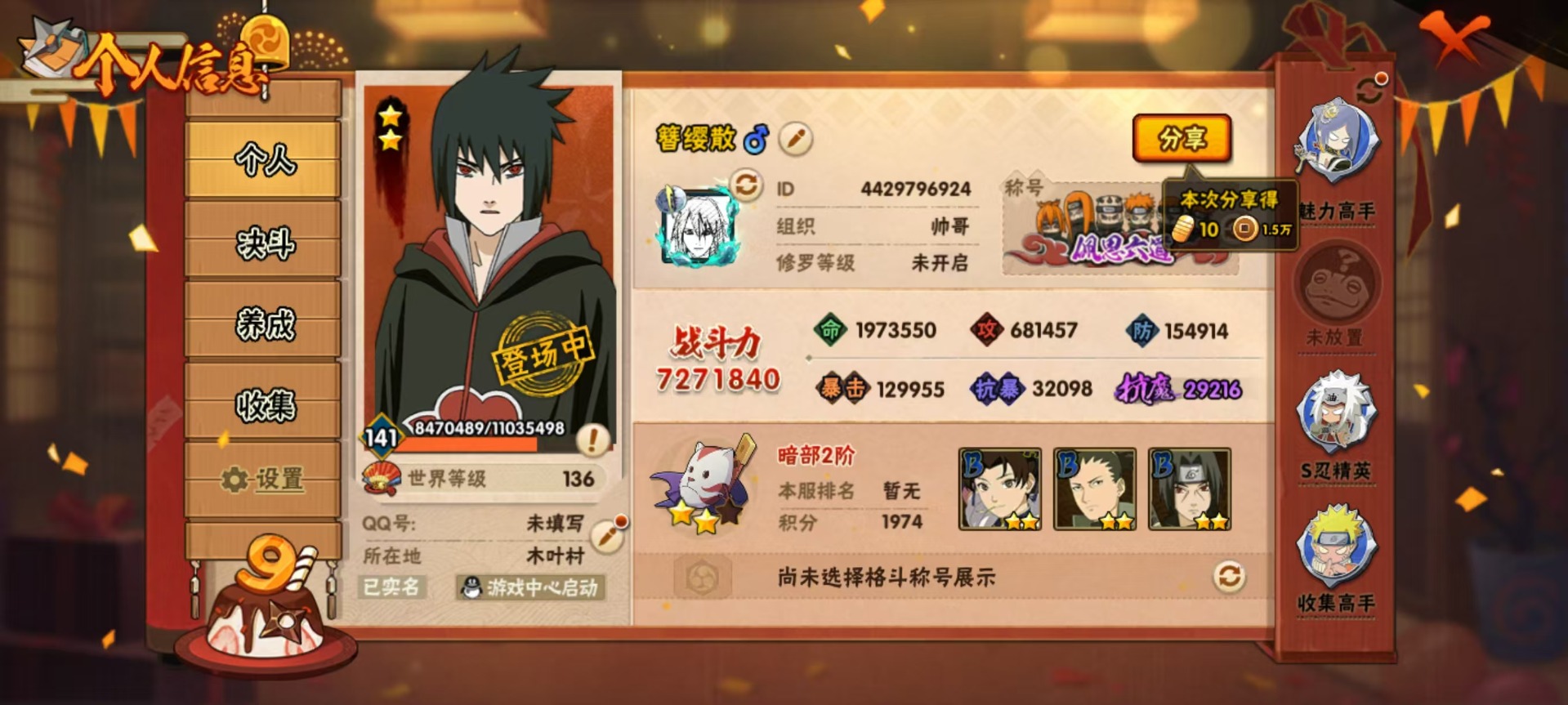 - [12255830]V7 7S忍 15A忍 14通灵 748.6W战力 可二次 可修改实名 优质装备:神秘面具男,宇智波带土 「忍界大战」,漩涡鸣人 「暴怒·第六尾」 S级忍者:自来也 「舞之豪杰」,宇智波鼬 「须佐能乎」,佩恩「天道」,猿飞日斩
