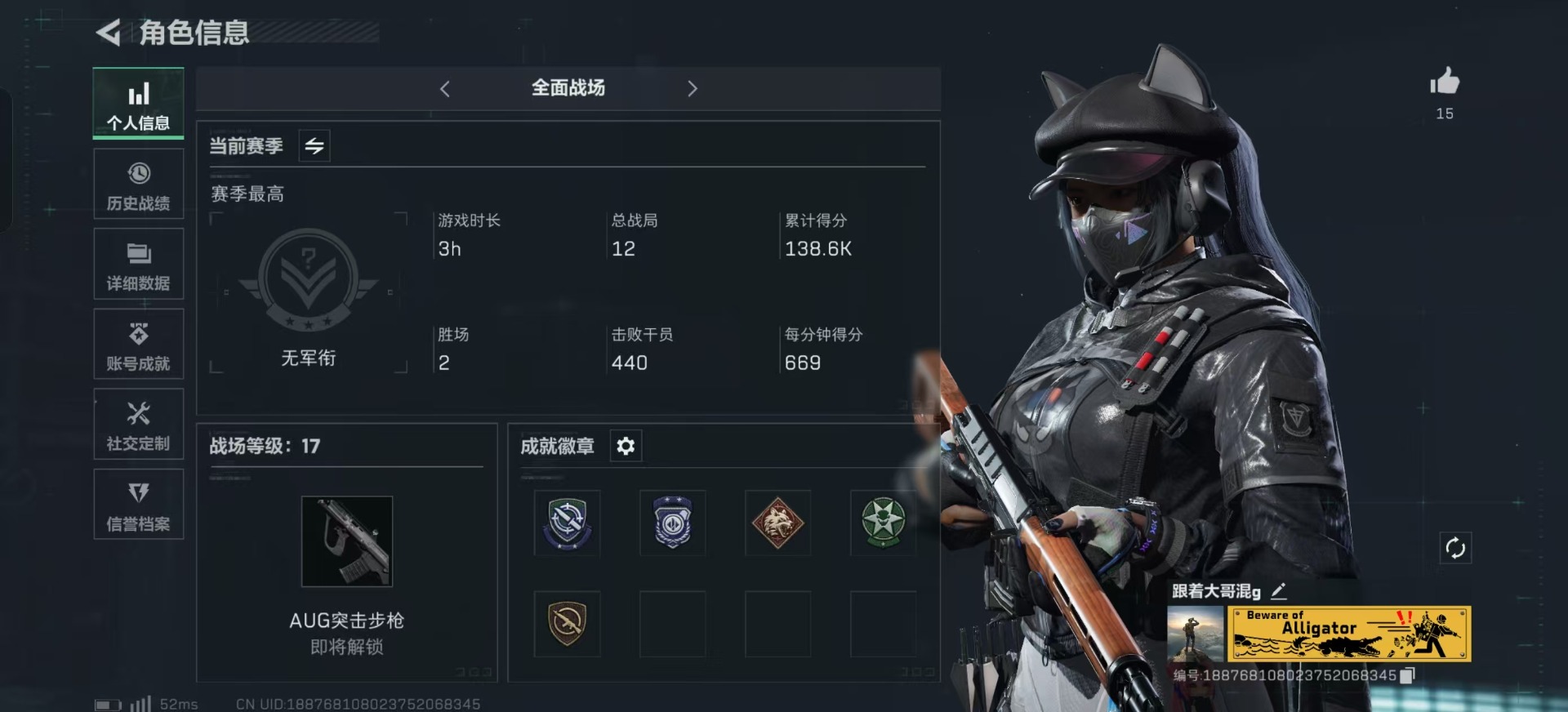 [11680266]总资产:101 1干员外观 3传说枪械 进阶安全箱(2×2)9.15号到期 可二次 可修改实名 烽火地带段位:钻石 全面战场段位:无段位 哈夫币:21.025 传说武器皮肤:SMG45冲锋枪-骑士,复合弓-黑-天际线,CAR-15突击步枪-阿米娅 史诗武器皮肤:PKM通用机枪-蝮蛇,G3战斗步枪-战场英杰,勇士冲锋枪-深海恐惧,SG552突击步枪-深海恐惧,AKM突击步枪-林中猎手,M16A4突击步枪-竞赛选手,M1014霰弹枪-林中猎手,SV-98狙击步枪-囚徒,SCAR-H战斗步枪-囚徒,沙漠之鹰-曙光,S12K霰弹枪-曙光 干员外观:露娜-黑·天际线
