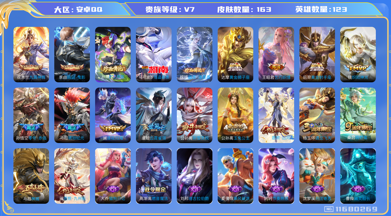 [11680269]V7 2典藏 3珍品传说 12传说 123英雄 163皮肤 可修改实名 优质装备:鸣剑·曳影,九霄神辉(木兰典藏),怪盗基德,器灵·落星盏,黄金狮子座,黄金射手座,炽阳神光,云霓雀翎,零号·赤焰,乞巧织情,澜逐花归海,琥珀纪元马超 珍品传说:时之奇旅-孙策 珍宝阁皮:妄想食味 限定皮:愿照·九州拓(澜年限),愿照·山河定(司空震年限),鸣野蒿,神威(电光马子),遇见飞天,祈雪灵祝(雪兔子),玉兔公主 史诗皮:星界战将,龙之律动,茶境仙,撼地雄心,破空之剑,战舞者,东方月初,谪仙醉月,琥珀纪元伽罗,百相守梦-百里守约,紫霞仙子,千年之狐,永昼,江河有灵,百解令(蒙犽),高渐离燃音魔法,蒙恬荣光圣徽,晚萤,末日机甲-吕布,猫狗日记-孙策,猫狗日记-大乔,节奏热浪,水果甜心,星夜王子,功夫厨神,德古拉伯爵,暗隐猎兽者,幽灵船长,鬼剑武藏,舞动绿茵,纤云弄巧,缤纷独角兽,乘风破浪,逐浪之夏,月团寄思,水晶猎龙者,金属风暴,原初追逐者,鹰眼统帅,暗夜贵公子