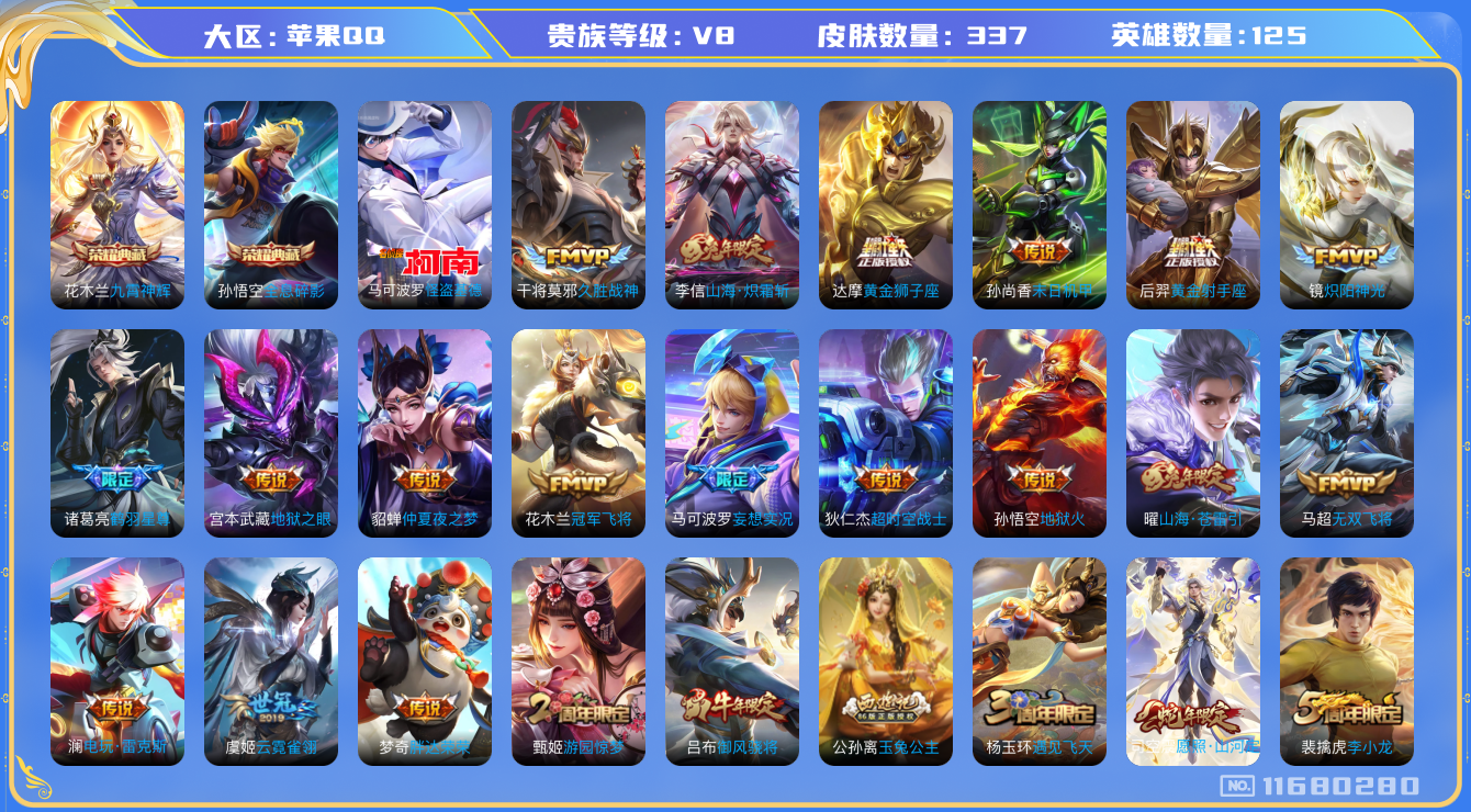 [11680280]V8 2典藏 1珍品传说 24传说 125英雄 337皮肤 可修改实名 优质装备:全息碎影(猴子典藏),九霄神辉(木兰典藏),怪盗基德,黄金狮子座,黄金射手座,冠军飞将,久胜战神,炽阳神光,云霓雀翎,末日机甲-孙尚香(绿蚂蚱),地狱火,仲夏夜之梦(大飞蛾),地狱之眼,胖达荣荣,超时空战士-狄仁杰,无双飞将,山海·炽霜斩(李信年限),山海·苍雷引(电光曜子),电玩·雷克斯,鹤羽星尊,妄想实况 珍宝阁皮:优雅恋人,玩趣恶龙 限定皮:愿照·九州拓(澜年限),愿照·山河定(司空震年限),鸣野蒿,至尊宝,遇见飞天,齐天大圣,五谷丰年,游园惊梦,梁祝,御风骁将(吕布年限),李小龙,孙行者,大圣娶亲,引擎之心,神奇女侠,美猴王,寅虎·赤拳(老虎年限),时之祈愿-云中君,玉兔公主 史诗皮:器灵·浮梦炉,破空之剑,怒海争锋,谪仙醉月,超元猎域,紫霞仙子,苍穹之光,电玩小子(小书包),白龙吟,黄金分割率,特工魅影,千年之狐,百相守梦(刘备),电玩·爆裂旋风,真我赫兹(百里守约),江河有灵,高渐离燃音魔法,蒙恬荣光圣徽,偶像歌手,白蛇,魅语,晚萤,青蛇,末日机甲-吕布,猫狗日记-孙策,猫狗日记-大乔,乱世虎臣,节奏热浪,修罗,女仆咖啡,摇滚巨星,水果甜心,绅士熊喵,天才门将,星夜王子,心灵骇客,功夫厨神,德古拉伯爵,暗隐猎兽者,幽灵船长,鬼剑武藏,暗渊魔法,心灵战警,天秀·启明,舞动绿茵,地狱岩魂,纤云弄巧,繁星吟游(呼啦呼啦),缤纷独角兽,乘风破浪,逐浪之夏,水晶猎龙者,曙光守护者,热力回旋,箭羽风息,金属风暴,原初追逐者,圣诞狂欢,圣诞恋歌,鹰眼统帅,暗夜贵公子,魅力维加斯,黎明之约,赏金猎手,无心,未来纪元-赵云