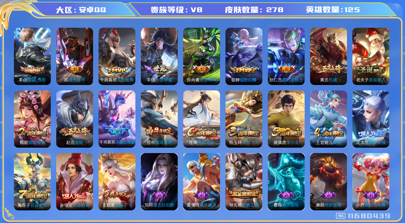 [11680439]V8 1典藏 7传说 125英雄 278皮肤 典藏英雄武则天 可修改实名 荣耀水晶:鸣剑·曳影 传说皮:末日机甲-孙尚香(绿蚂蚱),一念神魔,久胜战神,猫影幻舞,绛天战甲(鸡嘴战神),超时空战士-狄仁杰 珍宝阁皮:优雅恋人,玩趣恶龙 限定皮:凤凰于飞,遇见飞天,高山流水,五谷丰年,游园惊梦,梁祝,御风骁将(吕布年限),龙胆,烈魂,李小龙,圣诞老人,默契交锋-花木兰,大圣娶亲,冰霜恋舞曲 史诗皮:紫霞仙子,白龙吟,特工魅影,千年之狐,冰冠公主,青蛇,偶像歌手,末日机甲-吕布,猫狗日记-孙策,修罗,女仆咖啡,摇滚巨星,水果甜心,天才门将,星夜王子,功夫厨神,德古拉伯爵,暗隐猎兽者,幽灵船长,鬼剑武藏,心灵战警,乐园奇幻夜,舞动绿茵,地狱岩魂,纤云弄巧,繁星吟游(呼啦呼啦),拒霜思,缤纷独角兽,乘风破浪,逐浪之夏,水晶猎龙者,金属风暴,原初追逐者,圣诞狂欢,圣诞恋歌,鹰眼统帅,王者之锤,魅力维加斯,黎明之约,千筹问战,无心,未来纪元-赵云