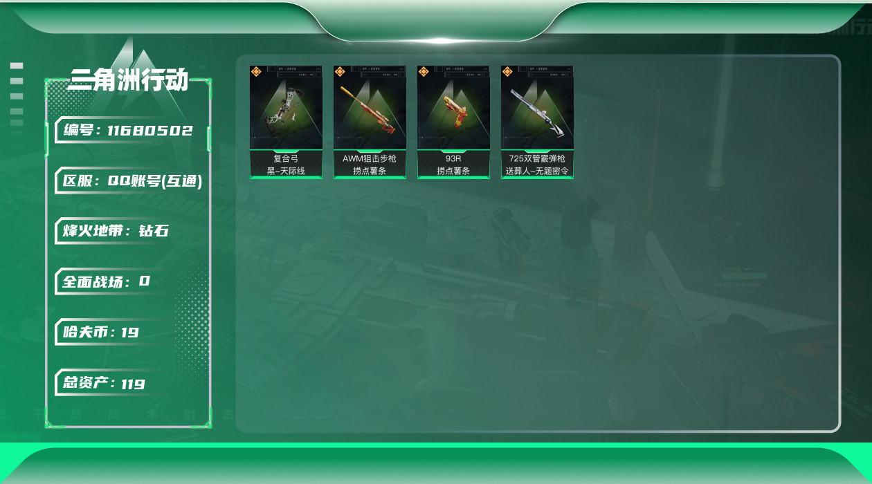 [11680502]总资产:119.7 4传说枪械 可二次 可修改实名 烽火地带段位:钻石 全面战场段位:上等兵 哈夫币:19.504 传说武器皮肤:93R-捞点薯条,AWM狙击步枪-捞点薯条,复合弓-黑-天际线,725双管霰弹枪-送葬人-无题密令