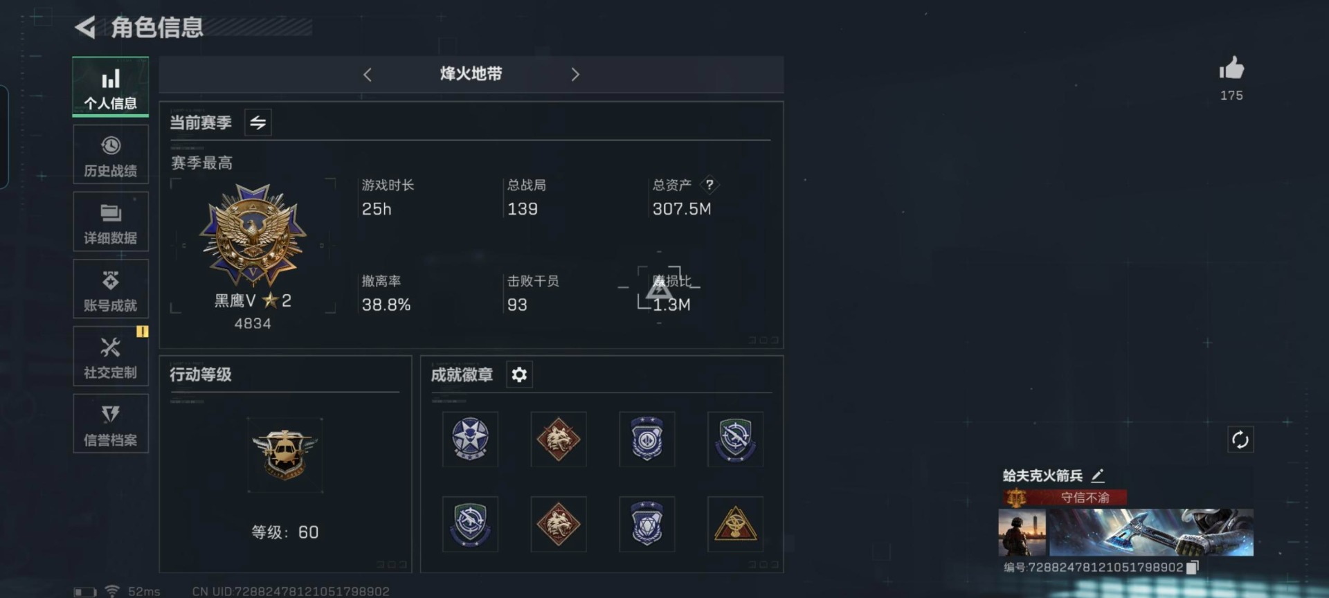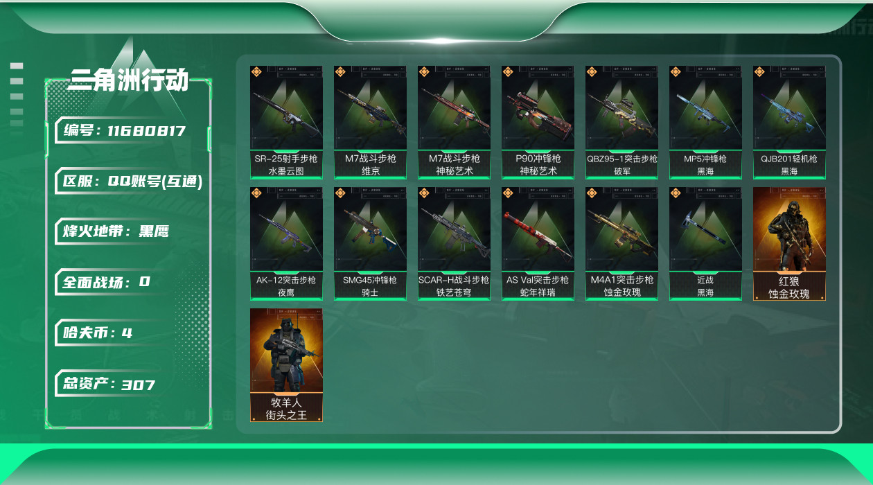 [11680817]总资产:307.5 2干员外观 1近战传说 13传说枪械 可二次 可修改实名 烽火地带段位:黑鹰 全面战场段位:军士长 哈夫币:4.875 传说武器皮肤:近战-黑海,AS Val突击步枪-蛇年祥瑞,SR-25射手步枪-水墨云图,SCAR-H战斗步枪-铁艺苍穹,AK-12突击步枪-夜鹰,SMG45冲锋枪-骑士,QJB201轻机枪-黑海,MP5冲锋枪-黑海,M7战斗步枪-维京,M4A1突击步枪-蚀金玫瑰,P90冲锋枪-神秘艺术,QBZ95-1突击步枪-破军,M7战斗步枪-神秘艺术 干员外观:红狼-蚀金玫瑰,牧羊人-街头之王