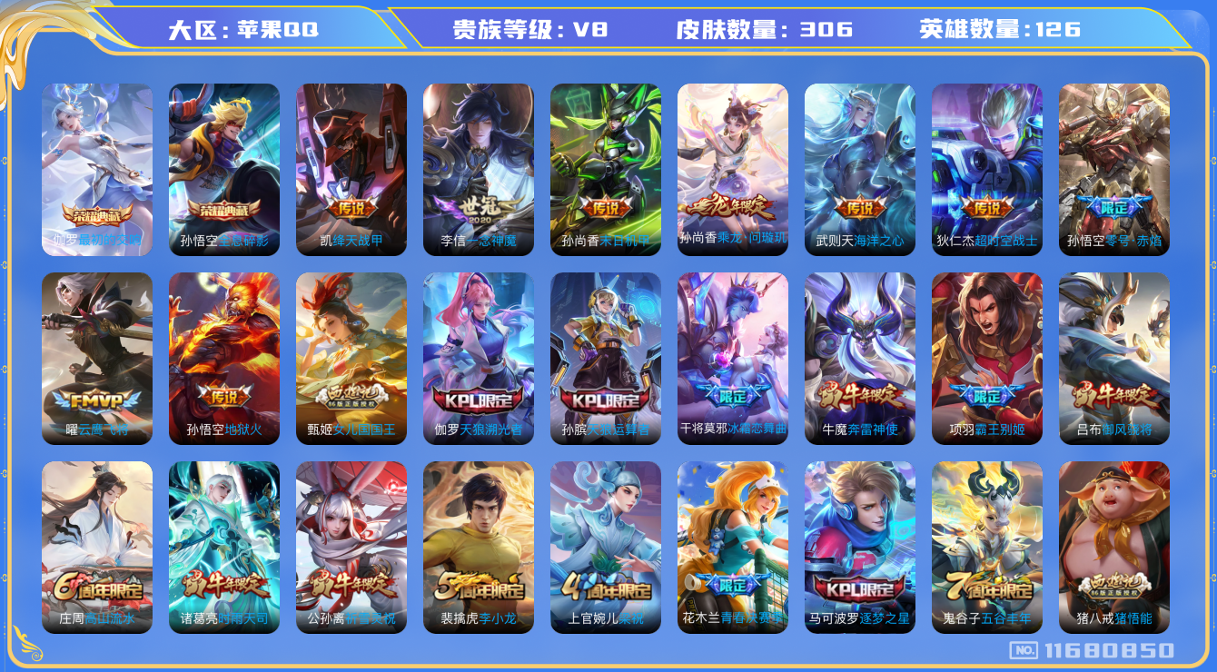 - [12234376]V8 1典藏 13传说 124英雄 281皮肤 可修改实名 女号 优质装备:神鉴启示录,云鹰飞将(小将军),炽阳神光,一念神魔,末日机甲-孙策,无双飞将,涂山容容 珍宝阁皮:万物之道,优雅恋人,玩趣恶龙 限定皮:愿照·九州拓(澜年限),愿照·众生和(妲己年限),鸣野蒿,夏侯惇霜北刀,傲雪梅枪,白晶晶,神威(电光马子),高山流水,诗剑行,五谷丰年,青龙志(铠年限),武圣,游园惊梦,梁祝,天狼绘梦者,李小龙,孙行者,青春决赛季,冰霜恋舞曲,匿光追影者,启示之音 史诗皮:化蝶舞,石田雨龙,东方月初,蒙犽顽岩魄,蔬乡物语(鲁班七号),遇见神鹿,紫霞仙子,苍穹之光,白龙吟,黄金分割率,特工魅影,永昼,冰冠公主,鹤归松栖(赵怀真),匿光侦查者,江河有灵,百解令(蒙犽),高渐离燃音魔法,魅语,电玩·爆裂旋风,晚萤,暗夜猫娘,猫狗日记-孙策,时之恋人-孙尚香,乱世虎臣,节奏热浪,修罗,女仆咖啡,摇滚巨星,水果甜心,绅士熊喵,天才门将,星夜王子,心灵骇客,功夫厨神,德古拉伯爵,暗隐猎兽者,幽灵船长,暗渊魔法,心灵战警,舞动绿茵,地狱岩魂,纤云弄巧,拒霜思,缤纷独角兽,乘风破浪,逐浪之夏,水晶猎龙者,曙光守护者,热力回旋,唤灵魅影,金属风暴,原初追逐者,圣诞狂欢,鹰眼统帅,王者之锤,暗夜贵公子,魅力维加斯,赏金猎手,无心,未来纪元-赵云