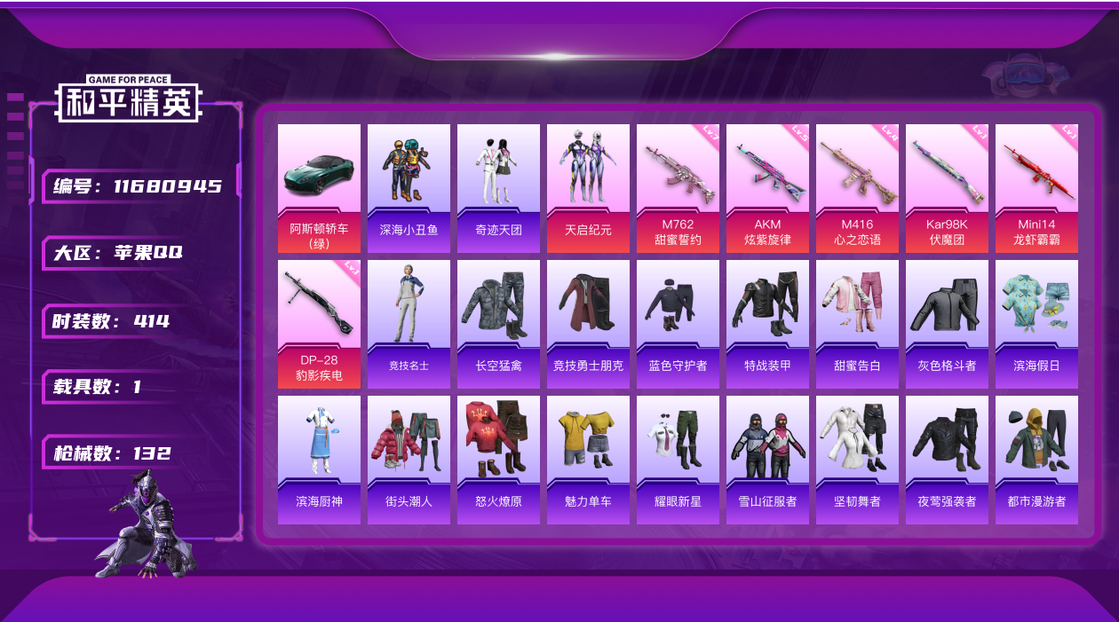 [11680945]1粉装 6特效枪 1载具 4印记 可二次 可修改实名 优质装备:阿斯顿·马丁DBS(绿),Mini14龙虾霸霸,M762甜蜜誓约,AKM炫紫旋律,Kar98K伏魔团,M416心之恋语,天启纪元,七级M762-甜蜜誓约 热门装扮:奇迹天团,深海小丑鱼 稀有枪皮:DP-28-豹影疾电 五级特效枪:五级Kar98K-伏魔团 四级特效枪:四级M416-心之恋语 一级特效枪:一级Kar98K-伏魔团,一级Mini14-龙虾霸霸,一级DP-28-豹影疾电 紫色装扮:SS23特训,幻彩翩翩,妙红点点,娇憨猪猪,萌趣咩咩,SS21特训,SS5特训,冰原使者,,冰川特警,冰焰天使,凛冬战士,北国孤狼,梦起落英,青春冒险家,光影梦想家,潮流游乐家,SS15特训,SS16特训,星河入梦,银白舞王,SS13特训,治愈之星,科技之星,SS14特训,萌趣颜团子,SS19特训,吉莉礼服,瑞龙福将,团圆交子,SS17特训,都市漫游者,金鼠迎春,长空猛禽,雪山征服者,雪山精英,霓虹街区,翡翠奔狼,耀眼新星,蓝色守护者,虎虎生威吉莉,街头潮人,超能勇士,跃动心情,飞行日记,魅力单车,鹤鸣,龙的传人,格斗先锋,滨海假日,圣诞大吉,坚韧舞者,夏日音浪,夜莺强袭者,怒火燎原,滨海厨神,甜蜜菠萝,疯狂小兔子,破蛋小黄鸡,甜蜜告白,福星高照,竞技勇士朋克,甜蜜熊情侣,牛气冲天,灰色格斗者,热血青春,牛气满满,特战装甲,镭射皇者,玉兔迎春,竞技名士,SS25特训,金羽特工,精神漫游,炽焰拳师,格斗专家,SS6特训,闪耀星光,黑色刀锋,核芯基因,SS7特训,清香五月粽,软嫩糖心蛋,深蓝冒险家,迷域探索者,拳皇97草薙京,云纹魔法士,SS8特训,青龙圣者,原初圣火,逆风勇士,SS12特训,韶华初心,纯白誓言,众神之王,智慧之神,SS9特训,风华少年志,白月香洋装,SS10特训,暗夜契约,SS11特训,萌黄之夏,金耀舞者,装甲骑士,丛林猎人,传奇侦探,奇趣企鹅,海上生明月 优质战备:至尊龙雀降落伞,龙虾霸霸降落伞,炫紫旋律降落伞,马卡龙降落伞,阿狸红降落伞,四圣焕新降落伞,飞行器-绮梦青鸾,齐天大圣降落伞