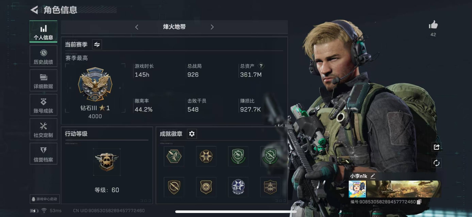 [11680998]可二次 可修改实名 实名:可修改 烽火地带段位:钻石 全面战场段位:上等兵 总资产:361.7 哈夫币:15.436 传说武器皮肤:SCAR-H战斗步枪-水墨云图,SR-25射手步枪-水墨云图,SCAR-H战斗步枪-铁艺苍穹,SMG45冲锋枪-骑士,复合弓-黑-天际线,CAR-15突击步枪-阿米娅,M7战斗步枪-神秘艺术 史诗武器皮肤:SR-3M紧凑突击步枪-英雄,QBZ95-1突击步枪-ACE,M4A1突击步枪-特勤执行,AUG突击步枪-特勤执行,Vector冲锋枪-红色彗星,PTR-32战斗步枪-ACE,SKS射手步枪-ACE,AUG突击步枪-蝮蛇,M700狙击步枪-蝮蛇,PKM通用机枪-蝮蛇,G3战斗步枪-战场英杰,MP5冲锋枪-深海恐惧,勇士冲锋枪-深海恐惧,SG552突击步枪-深海恐惧,AKM突击步枪-林中猎手,M16A4突击步枪-竞赛选手,M1014霰弹枪-林中猎手,SV-98狙击步枪-林中猎手,PTR-32突击步枪-英雄,M250通用机枪-囚徒,SV-98狙击步枪-囚徒,沙漠之鹰-曙光,S12K霰弹枪-曙光,M700狙击步枪-竞技风,QSZ92G-风林火山 干员外观:威龙-壮志凌云,骇爪-水墨云图