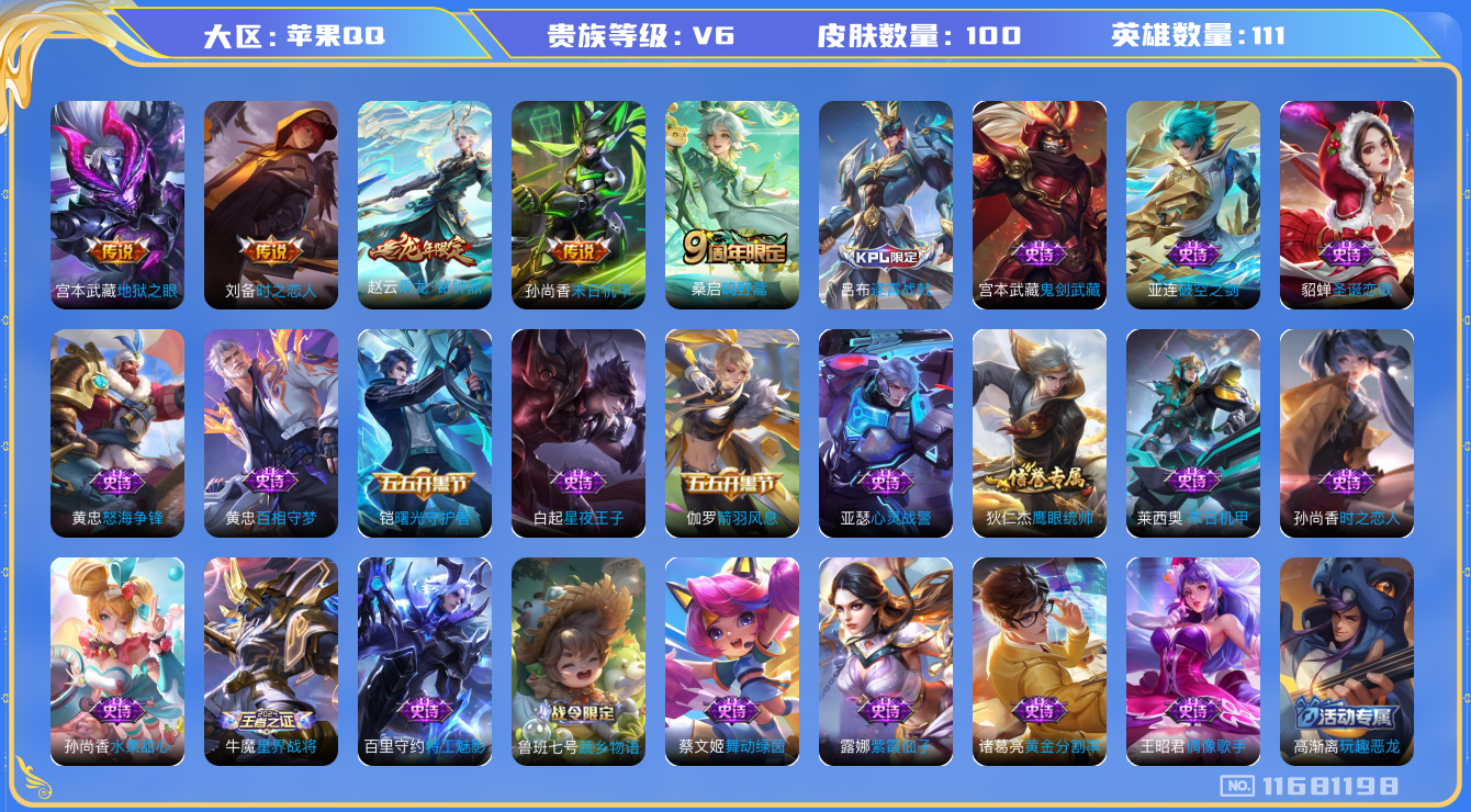 [11681198]V6 5传说 111英雄 100皮肤 可修改实名 优质装备:末日机甲-孙尚香(绿蚂蚱),地狱之眼,时之恋人-刘备(电焊工) 传说皮:乘龙·铭钟鼎(赵云年限) 珍宝阁皮:玩趣恶龙 限定皮:逐霄战戟,鸣野蒿 史诗皮:星界战将,怒海争锋,破空之剑,蔬乡物语(鲁班七号),百相守梦-黄忠,紫霞仙子,黄金分割率,特工魅影,末日机甲-莱西奥,偶像歌手,时之恋人-孙尚香,水果甜心,星夜王子,鬼剑武藏,心灵战警,舞动绿茵,曙光守护者,箭羽风息,圣诞恋歌,鹰眼统帅