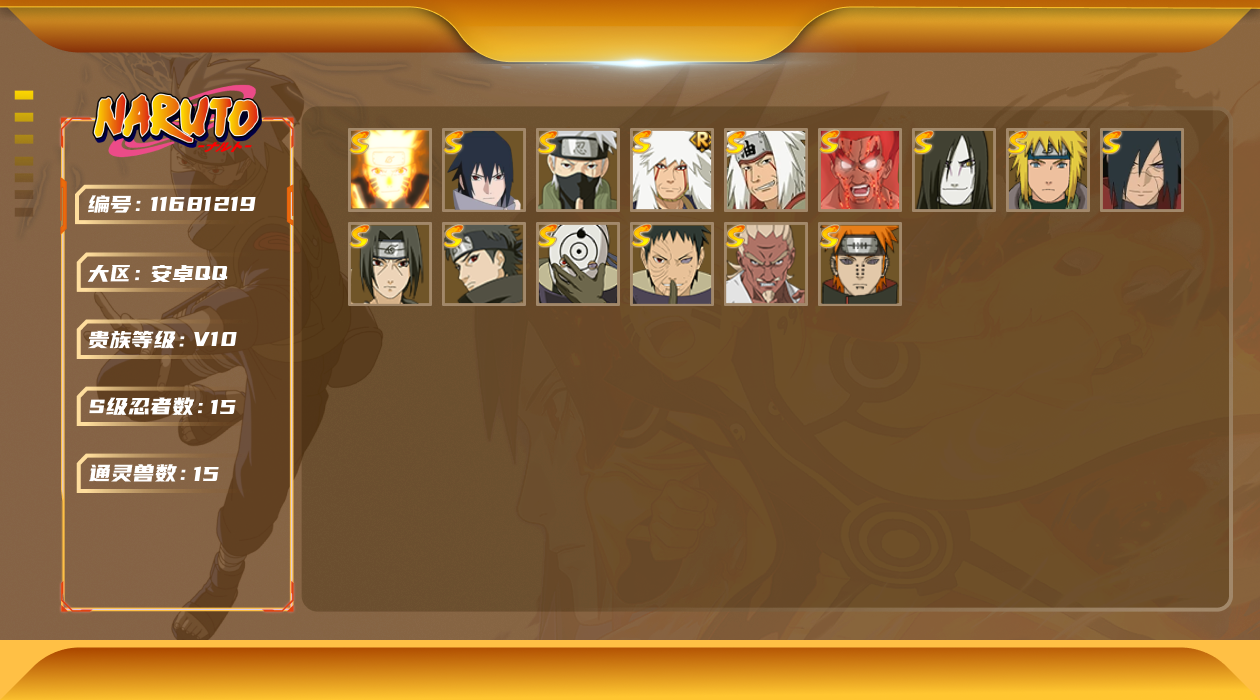 [11681219]V10 15S忍 13A忍 15通灵 584.6W战力 可二次 可修改实名 优质装备:迈特凯「死门」,宇智波带土 「忍界大战」,“宇智波斑” 「白面具」,漩涡鸣人 「九喇嘛连结」,宇智波佐助「永恒万花筒」,宇智波斑「秽土转生·解」,艾「忍界大战」,宇智波止水「须佐能乎」,旗木卡卡西「须佐能乎」,自来也 「传说中的三忍」 S级忍者:自来也 「舞之豪杰」,宇智波鼬 「须佐能乎」,佩恩「天道」,波风水门,大蛇丸