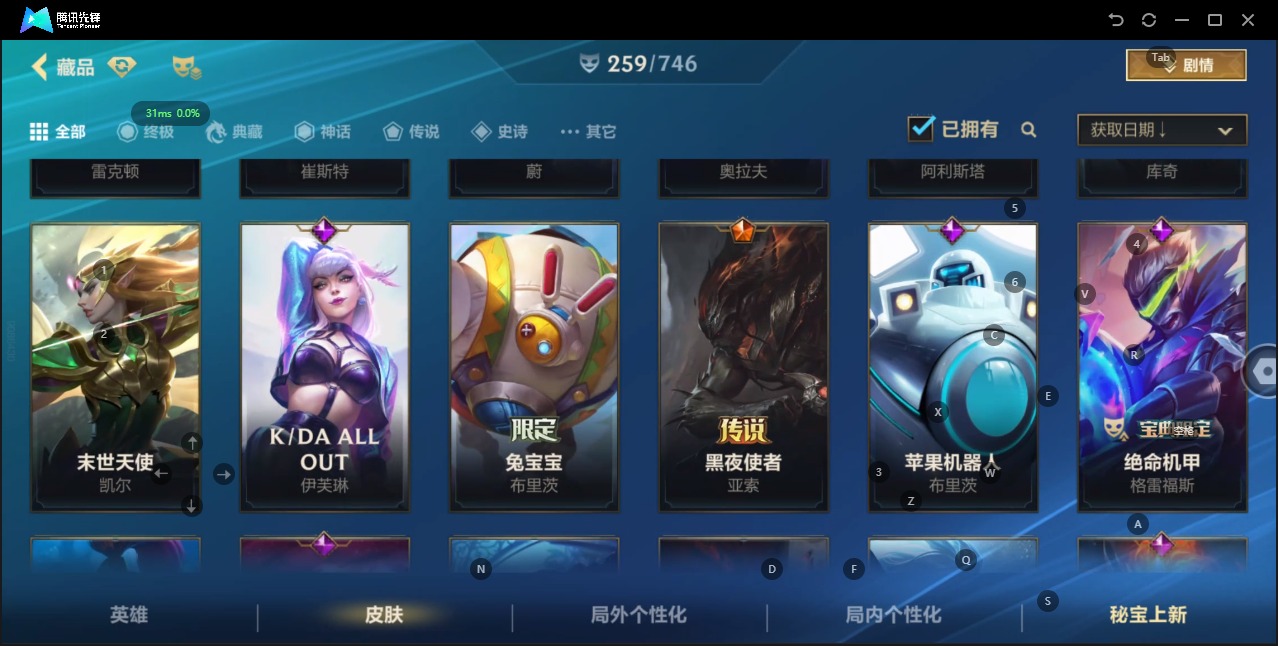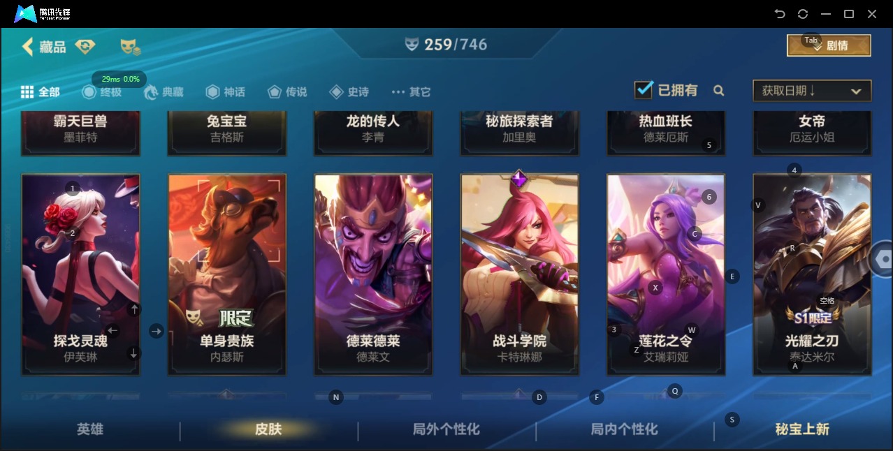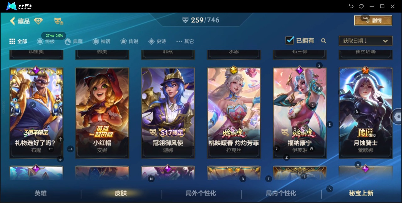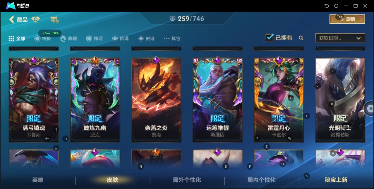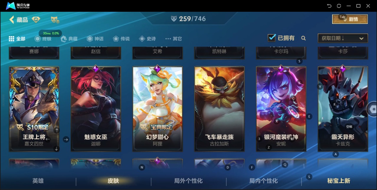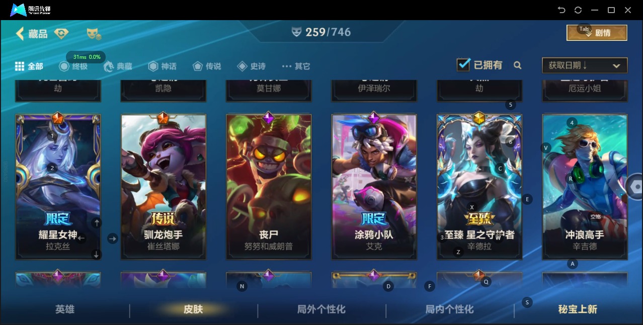 - PX_2093363-97 安卓QQ/尊贵铂金/205皮肤/123英雄/1典藏/0珍品无双/0无双/0珍品传说/4传说/58史诗/7稀有英雄 【1 典藏皮肤】拾光映像 瑶, 【4 传说皮肤】云霓雀翎 虞姬,云鹰飞将 曜,超时空战士 狄仁杰,冠军飞将 花木兰, 【58 史诗皮肤】时之奇旅 安琪拉,电玩小子 鲁班七号,末日机甲 吕布,紫霞仙子 露娜,百解令 蒙犽,高山流水 庄周,燃音魔法 高渐离,山海