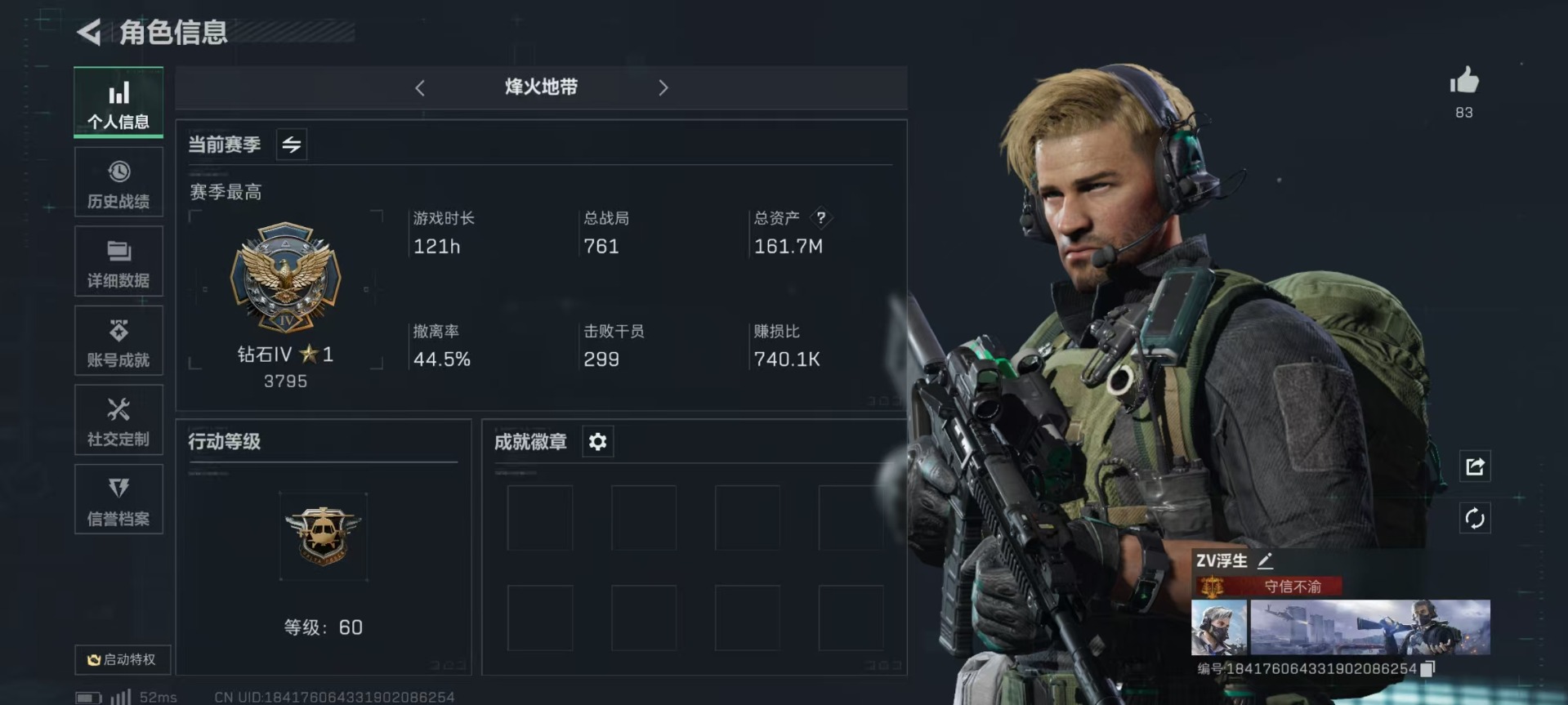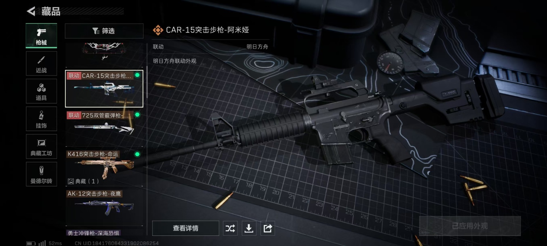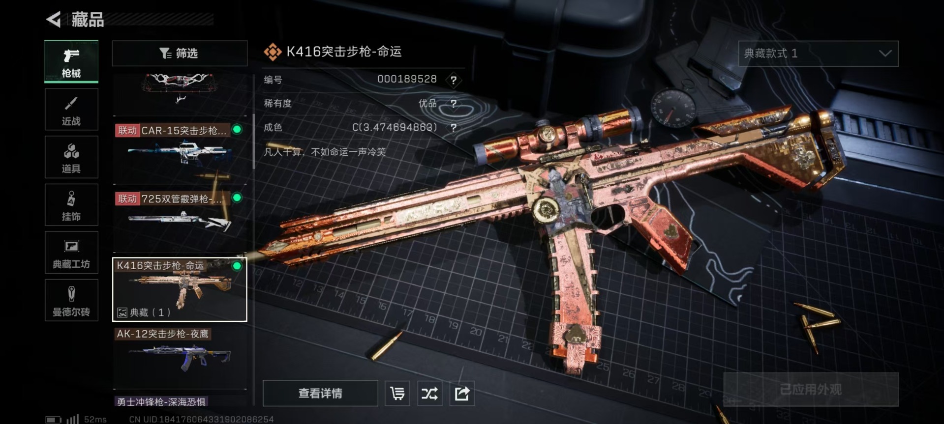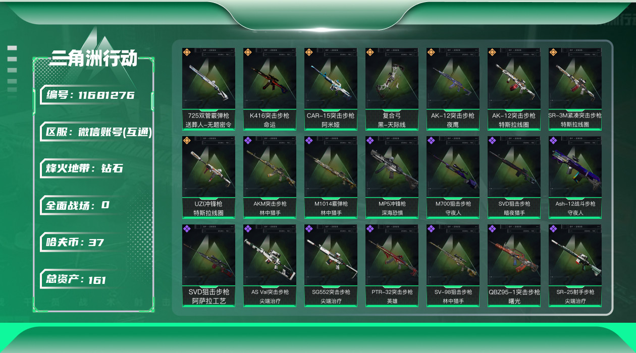 [11681276]总资产:161.7 1干员外观 8传说枪械 顶级安全箱(9.17到期) 可二次 可修改实名 优质装备:K416突击步枪-命运(典藏),顶级安全箱(3x3) 烽火地带段位:钻石 全面战场段位:校官 哈夫币:37.394 传说武器皮肤:AK-12突击步枪-夜鹰,CAR-15突击步枪-阿米娅,复合弓-黑-天际线,AK-12突击步枪-特斯拉线圈,SR-3M紧凑突击步枪-特斯拉线圈,UZI冲锋枪-特斯拉线圈,725双管霰弹枪-送葬人-无题密令 史诗武器皮肤:SR-25射手步枪-尖端治疗,PKM通用机枪-荒野求生,AS Val突击步枪-尖端治疗,M700狙击步枪-守夜人,SG552突击步枪-尖端治疗,Ash-12战斗步枪-守夜人,MP5冲锋枪-深海恐惧,AKM突击步枪-林中猎手,SVD狙击步枪-暗夜猎手,PKM通用机枪-守夜人,SVD狙击步枪-荒野求生,M1014霰弹枪-林中猎手,SV-98狙击步枪-林中猎手,PTR-32突击步枪-英雄,QBZ95-1突击步枪-曙光,SVD狙击步枪-阿萨拉工艺 干员外观:蜂医-送葬人·无题密令(S5)