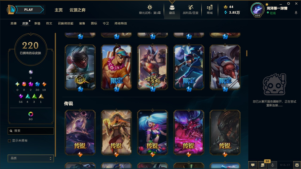 - PX_2094104-贵族等级: V8 英雄数: 124 皮肤数: 294 荣耀水晶: 拾光映像 无双皮: 真我赫兹(瑶),小乔时之魔女 珍品传说: 器灵·落星盏,兔狲·蓬尾,大耳狗之梦 星传说: 未来机甲,金色仲夏夜,岁雨灵司 传说皮: 炽阳神光,云霓雀翎,仲夏夜之梦,音你心动-小乔,乞巧织情,淬星耀世,挚爱之约,音你闪耀,山海·琳琅生,炽翼辉光,牧神诗旅,幻光神枪,云诺千山 限定皮: 遇见飞天