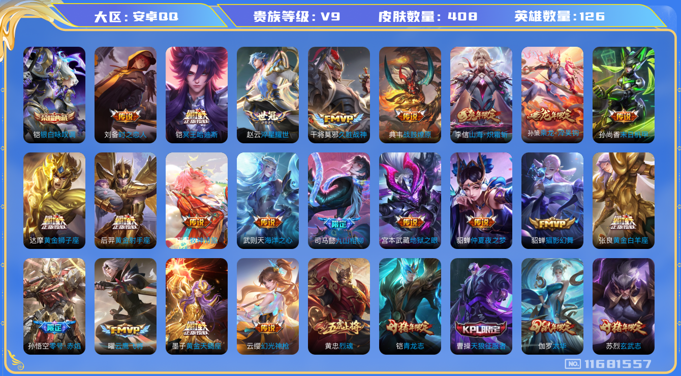 [11681557]V9 1典藏 36传说 126英雄 408皮肤 典藏英雄武则天 可修改实名 优质装备:银白咏叹调(倪克斯侍卫),黄金狮子座,黄金射手座,云鹰飞将(小将军),黄金白羊座,猫影幻舞,久胜战神,末日机甲-孙尚香(绿蚂蚱),仲夏夜之梦(大飞蛾),零号·赤焰,海洋之心,地狱之眼,时之恋人-刘备(电焊工),淬星耀世,山海·炽霜斩(李信年限),黄金天蝎座,牧神诗旅 传说皮:乘龙·淬吴钩(孙策年限),典韦战鼓燎原,九山相柳,铠冥王哈迪斯,幻光神枪 珍宝阁皮:女武神,玩趣恶龙 限定皮:愿照·九州拓(澜年限),愿照·福禄聚(蔡文姬年限),愿照·岁时盈(虞姬年限),愿照·山河定(司空震年限),愿照·众生和(妲己年限),愿照·千秋盛(女娲年限),逐霄战戟,陌上桑,鸣野蒿,至尊宝,白虎志(电光耗子),凤求凰(白切鸡),太华(伽罗年限),绯月行,时之彼端,魔法小厨娘,白晶晶,时雨天司(水龙头),飞衡(韩信年限),玄嵩(庄周年限),五谷丰年,青龙志(铠年限),冰锋战神,武圣,天狼运算者,梁祝,逐梦之星,烈魂,天狼征服者,天狼绘梦者,李小龙,玄武志(苏烈年限),朱雀志(守约年限),如梦令-后羿,孙行者,天魔缭乱,冰霜恋舞曲,云端筑梦师,蜜橘之夏,神奇女侠,时之奇旅-妲己,山海·玄木吟(马可年限) 史诗皮:苍鳞隐世,器灵·浮梦炉,化蝶舞,星界特工,星界战将,龙之律动,石田雨龙,撼地雄心,破空之剑,战舞者,芈月浮光幕影,怒海争锋,谪仙醉月,乘龙·聚宝船(安琪拉年限),百相守梦-百里守约,遇见神鹿,紫霞仙子,苍穹之光,黄金分割率,特工魅影,千年之狐,永昼,电玩·爆裂旋风,江河有灵,百解令(蒙犽),蒙恬荣光圣徽,偶像歌手,白蛇,暗夜猫娘,魅语,无限星赏官,晚萤,冰冠公主,青蛇,末日机甲-吕布,猫狗日记-孙策,猫狗日记-大乔,时之恋人-孙尚香,乱世虎臣,节奏热浪,修罗,女仆咖啡,摇滚巨星,水果甜心,绅士熊喵,天才门将,星夜王子,心灵骇客,功夫厨神,德古拉伯爵,暗隐猎兽者,幽灵船长,鬼剑武藏,暗渊魔法,心灵战警,乐园奇幻夜,天秀·启明,舞动绿茵,地狱岩魂,诗语江南,纤云弄巧,繁星吟游(呼啦呼啦),拒霜思,缤纷独角兽,乘风破浪,逐浪之夏,龙鼓争鸣,水晶猎龙者,曙光守护者,箭羽风息,金属风暴,原初追逐者,圣诞狂欢,圣诞恋歌,鹰眼统帅,暗夜贵公子,魅力维加斯,赏金猎手,无心,未来纪元-赵云