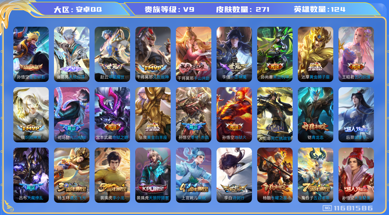 [11681586]V9 1典藏 1无双 19传说 124英雄 271皮肤 可修改实名 优质装备:全息碎影(猴子典藏),天机白泽,黄金狮子座,黄金白羊座,久胜战神,炽阳神光,一念神魔,末日机甲-孙尚香(绿蚂蚱),地狱火,零号·赤焰,地狱之眼,乞巧织情,淬星耀世,千山共赴,涂山容容 传说皮:死亡执政官,九山相柳 珍宝阁皮:蔷薇恋人 限定皮:至尊宝,白虎志(电光耗子),飞衡(韩信年限),遇见飞天,诗剑行,五谷丰年,青龙志(铠年限),梁祝,天狼狩猎者,李小龙,永曜之星,如梦令-嫦娥,如梦令-后羿,大圣娶亲,天魔缭乱 史诗皮:赞萌露比,鸭鸭历险记-刘禅,灵蛊蚀心,龙之律动,石田雨龙,百相守梦-周瑜,幻珠鲛人,百相守梦-黄忠,紫霞仙子,黄金分割率,特工魅影,千年之狐,冰冠公主,偶像歌手,晚萤,猫狗日记-孙策,乱世虎臣,修罗,女仆咖啡,摇滚巨星,水果甜心,绅士熊喵,星夜王子,心灵骇客,功夫厨神,德古拉伯爵,暗隐猎兽者,幽灵船长,鬼剑武藏,心灵战警,天秀·启明,纤云弄巧,繁星吟游(呼啦呼啦),逐浪之夏,水晶猎龙者,箭羽风息,金属风暴,原初追逐者,圣诞狂欢,圣诞恋歌,鹰眼统帅,魅力维加斯,黎明之约,赏金猎手,未来纪元-赵云