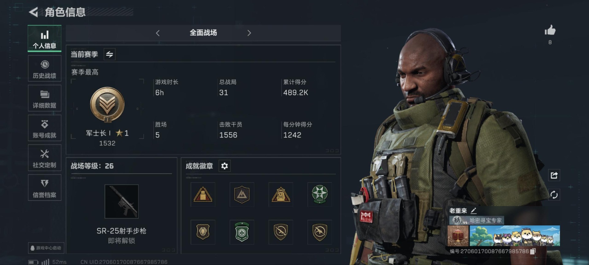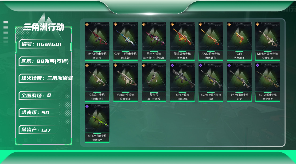 [11681601]总资产:137.2M 10传说枪械 哈夫币:50.768K 顶级安全箱(3×3)9.15号到期 可二次 可修改实名 优质装备:顶级安全箱(3x3) 烽火地带段位:三角洲巅峰 全面战场段位:军士长 传说武器皮肤:93R-捞点薯条,Vector冲锋枪-狩猎时刻,G3战斗步枪-狩猎时刻,M16A4突击步枪-狩猎时刻,AWM狙击步枪-捞点薯条,腾龙突击步枪-捞点薯条,CAR-15突击步枪-阿米娅,勇士冲锋枪-能天使-午夜邮差,复合弓-黑-天际线,M4A1突击步枪-阿米娅 史诗武器皮肤:M16A4突击步枪-竞赛选手,MP5冲锋枪-深海恐惧,SV-98狙击步枪-林中猎手,SV-98狙击步枪-囚徒,SCAR-H战斗步枪-囚徒
