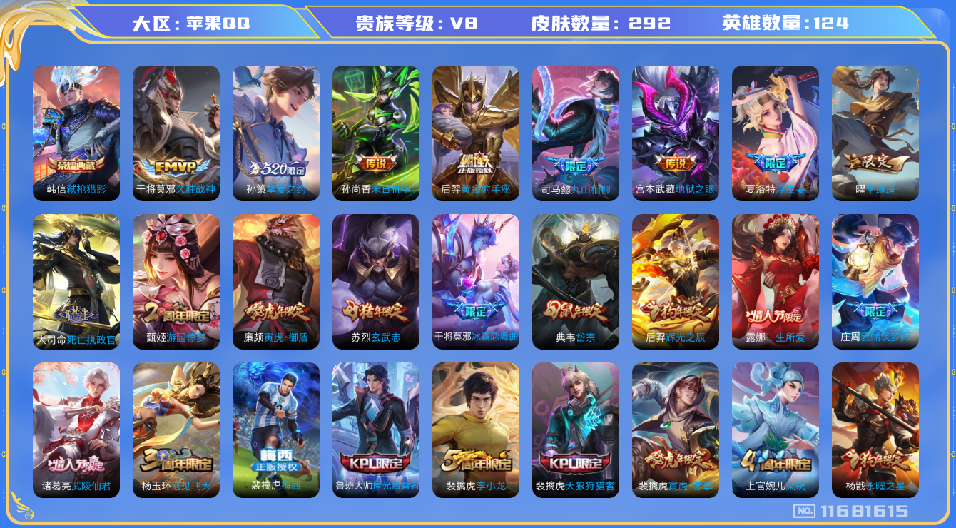 [11681615]V8 1典藏 14传说 124英雄 292皮肤 典藏英雄武则天 可修改实名 优质装备:弑枪猎影(韩信典藏),黄金射手座,久胜战神,末日机甲-孙尚香(绿蚂蚱),地狱之眼,李逍遥,挚爱之约,浮生妄 传说皮:死亡执政官,九山相柳 珍宝阁皮:妄想食味,玩趣恶龙 限定皮:至尊宝,梅西,武陵仙君(小桃花),傲雪梅枪,星穹之声,山海·碧波行(瑶年限),遇见飞天,五谷丰年,冰锋战神,游园惊梦,梁祝,天狼狩猎者,岱宗(典韦年限),李小龙,玄武志(苏烈年限),永曜之星,辉光之辰,孙行者,一生所爱,冰霜恋舞曲,云端筑梦师,寅虎·御盾(廉颇年限),寅虎·赤拳(老虎年限),时之祈愿-云中君,匿光启智者,山海·玄木吟(马可年限) 史诗皮:化蝶舞,龙之律动,石田雨龙,茶境仙,百相守梦-黄忠,紫霞仙子,黄金分割率,特工魅影,千年之狐,魅语,蒙恬荣光圣徽,冰冠公主,偶像歌手,龙骑士(小龙虾),末日机甲-吕布,猫狗日记-孙策,猫狗日记-大乔,乱世虎臣,节奏热浪,女仆咖啡,摇滚巨星,水果甜心,天才门将,星夜王子,心灵骇客,功夫厨神,德古拉伯爵,暗隐猎兽者,幽灵船长,鬼剑武藏,暗渊魔法,心灵战警,乐园奇幻夜,地狱岩魂,纤云弄巧,缤纷独角兽,乘风破浪,逐浪之夏,水晶猎龙者,曙光守护者,金属风暴,原初追逐者,圣诞恋歌,鹰眼统帅,黎明之约,雪上飞焰,滕王阁序,寅虎·御盾,无心,未来纪元-赵云