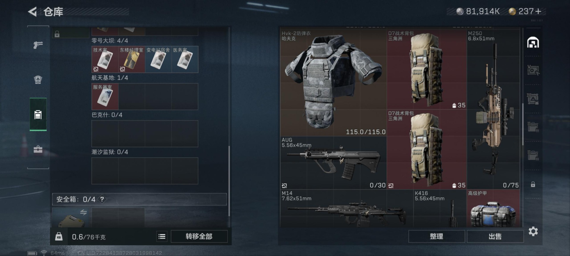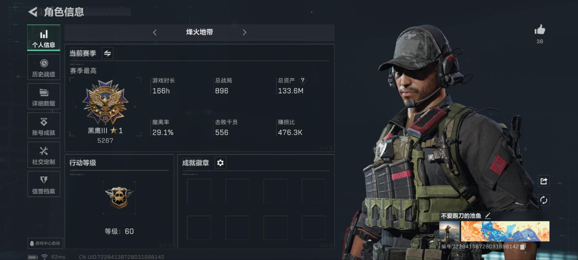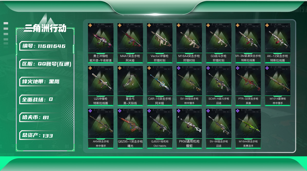 [11681646]总资产:133.6M 10传说枪械 哈夫币:81.914K 进阶安全箱(2×2)9.15号到期 可二次 可修改实名 烽火地带段位:黑鹰 全面战场段位:军士长 传说武器皮肤:UZI冲锋枪-特斯拉线圈,M16A4突击步枪-狩猎时刻,AK-12突击步枪-特斯拉线圈,SR-3M紧凑突击步枪-特斯拉线圈,勇士冲锋枪-能天使-午夜邮差,Vector冲锋枪-狩猎时刻,G3战斗步枪-狩猎时刻,复合弓-黑-天际线,M4A1突击步枪-阿米娅,CAR-15突击步枪-阿米娅 史诗武器皮肤:PKM通用机枪-蝮蛇,M16A4突击步枪-竞赛选手,M1014霰弹枪-林中猎手,AKM突击步枪-林中猎手,QJB201轻机枪-Old Habits,SV-98狙击步枪-林中猎手,PTR-32突击步枪-英雄,SV-98狙击步枪-囚徒,SCAR-H战斗步枪-囚徒,QBZ95-1突击步枪-曙光
