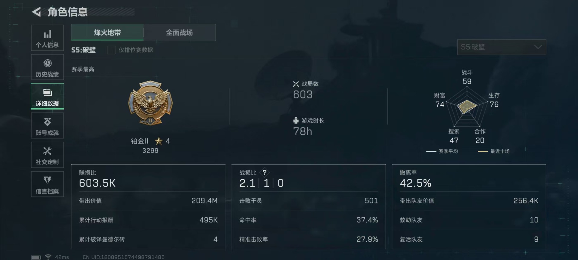 - [11607462]总资产:174.2M 1干员外观 1近战传说 8传说枪械 哈夫币:13.460K 可二次 可修改实名 优质装备:近战-北极星 烽火地带段位:铂金 全面战场段位:无段位 传说武器皮肤:勇士冲锋枪-能天使-午夜邮差,复合弓-黑-天际线,K437突击步枪-北极星,QCQ171冲锋枪-北极星,M4A1突击步枪-阿米娅,CAR-15突击步枪-阿米娅,M4A1突击步枪-蚀金玫瑰 干员外观:红狼-蚀金玫瑰