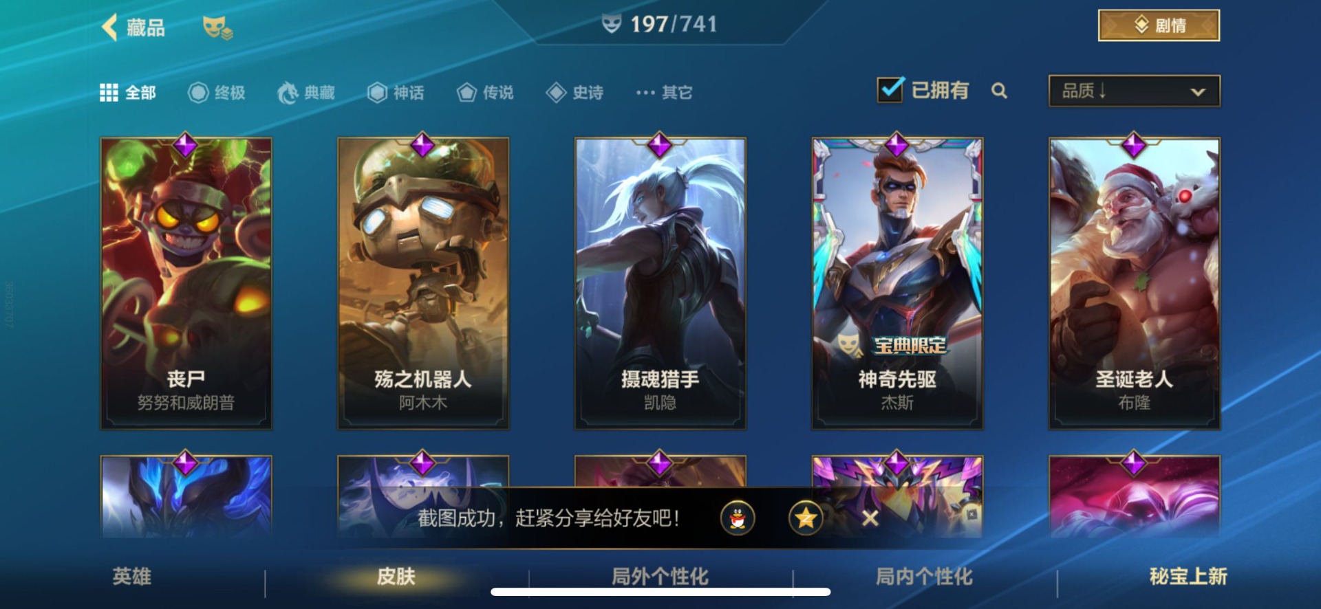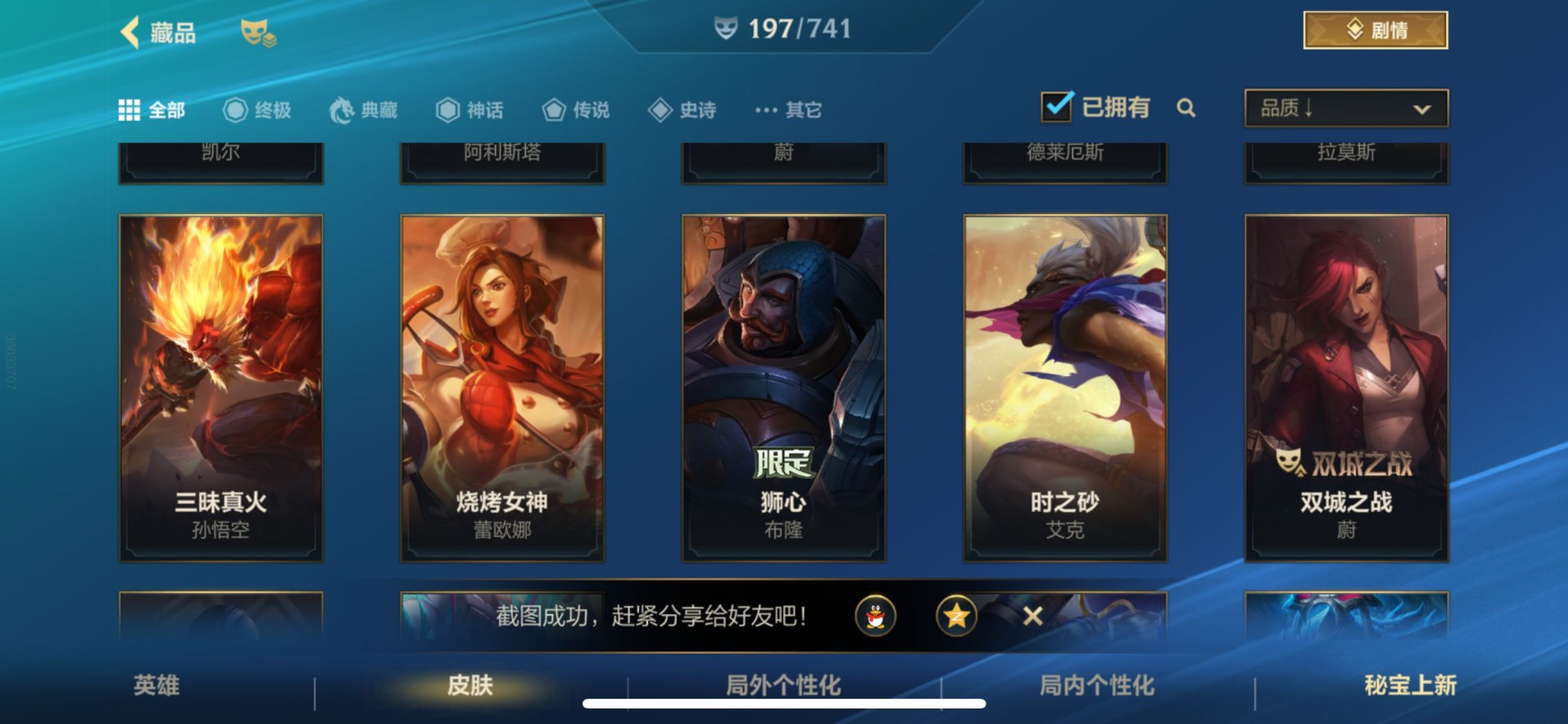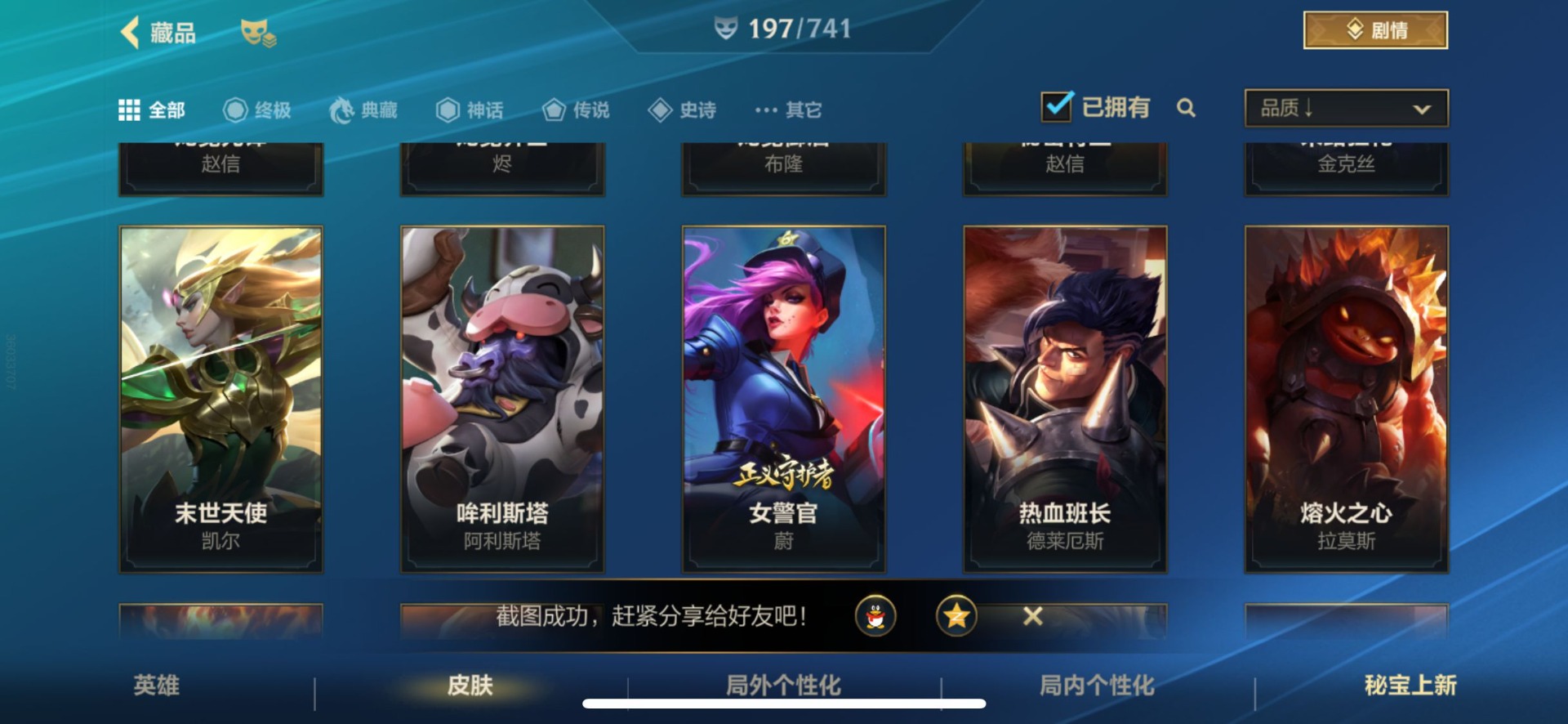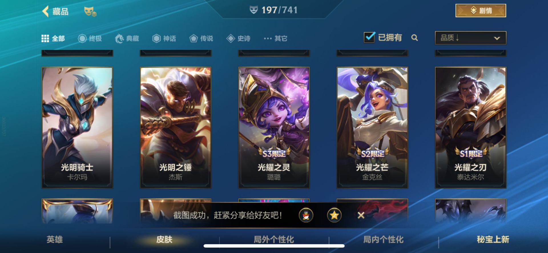 - [12076254]V7 5传说 124英雄 199皮肤 可修改实名 优质装备:超时空战士-狄仁杰,澜逐花归海 传说皮:幻光神枪 珍宝阁皮:胡桃夹子,蔷薇恋人 限定皮:愿照·九州拓(澜年限),逐霄战戟,鸣野蒿,至尊宝,五谷丰年,李小龙,逐梦之影,孙行者 史诗皮:器灵·浮梦炉,化蝶舞,紫霞仙子,电玩小子(小书包),黄金分割率,特工魅影,千年之狐,江河有灵,百解令(蒙犽),高渐离燃音魔法,末日机甲-吕布,猫狗日记-孙策,节奏热浪,修罗,女仆咖啡,摇滚巨星,水果甜心,星夜王子,心灵骇客,功夫厨神,德古拉伯爵,幽灵船长,鬼剑武藏,纤云弄巧,繁星吟游(呼啦呼啦),乘风破浪,逐浪之夏,曙光守护者,金属风暴,圣诞恋歌,鹰眼统帅,暗夜贵公子,魅力维加斯,赏金猎手,天秀·音浪,未来纪元-赵云